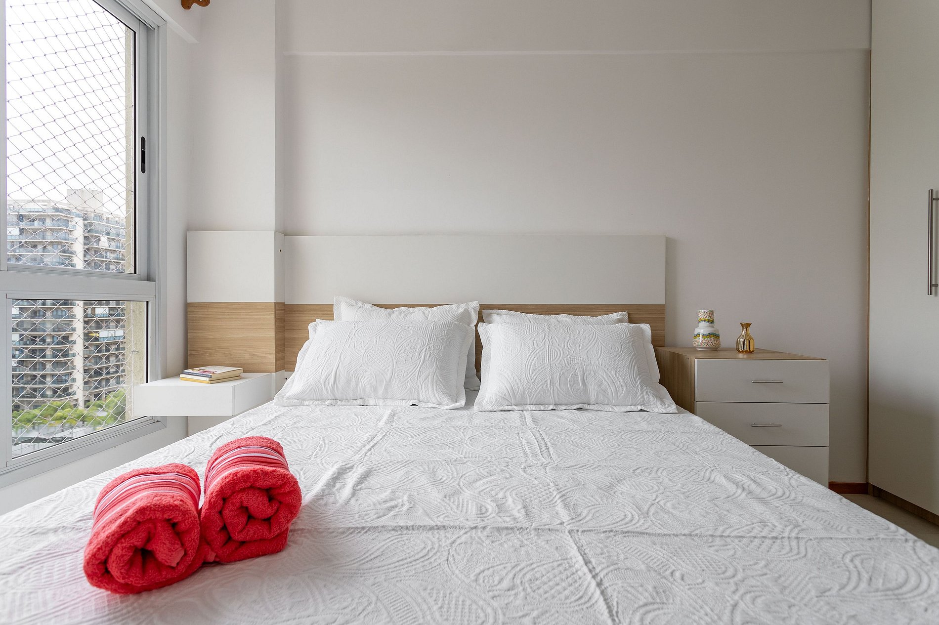 Composto por 1 suíte com cama casal queen, armário, black out e ar condicionado.
