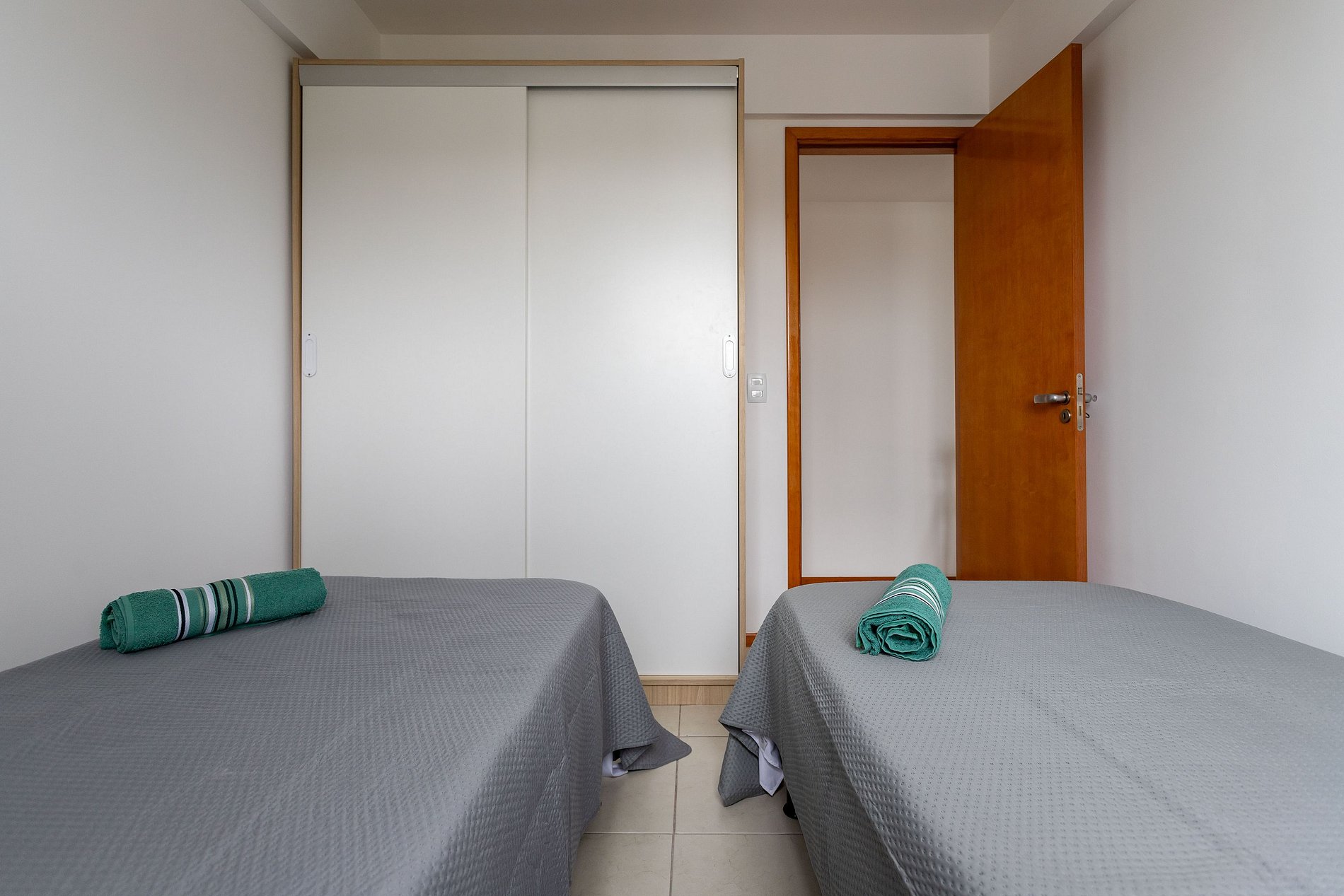 Terceiro quarto com duas camas de solteiro, black out, armário e ar condicionado.