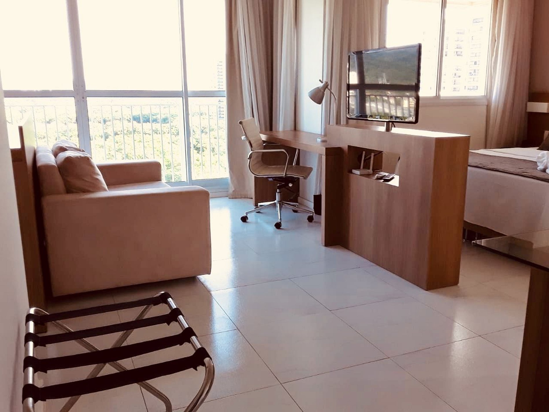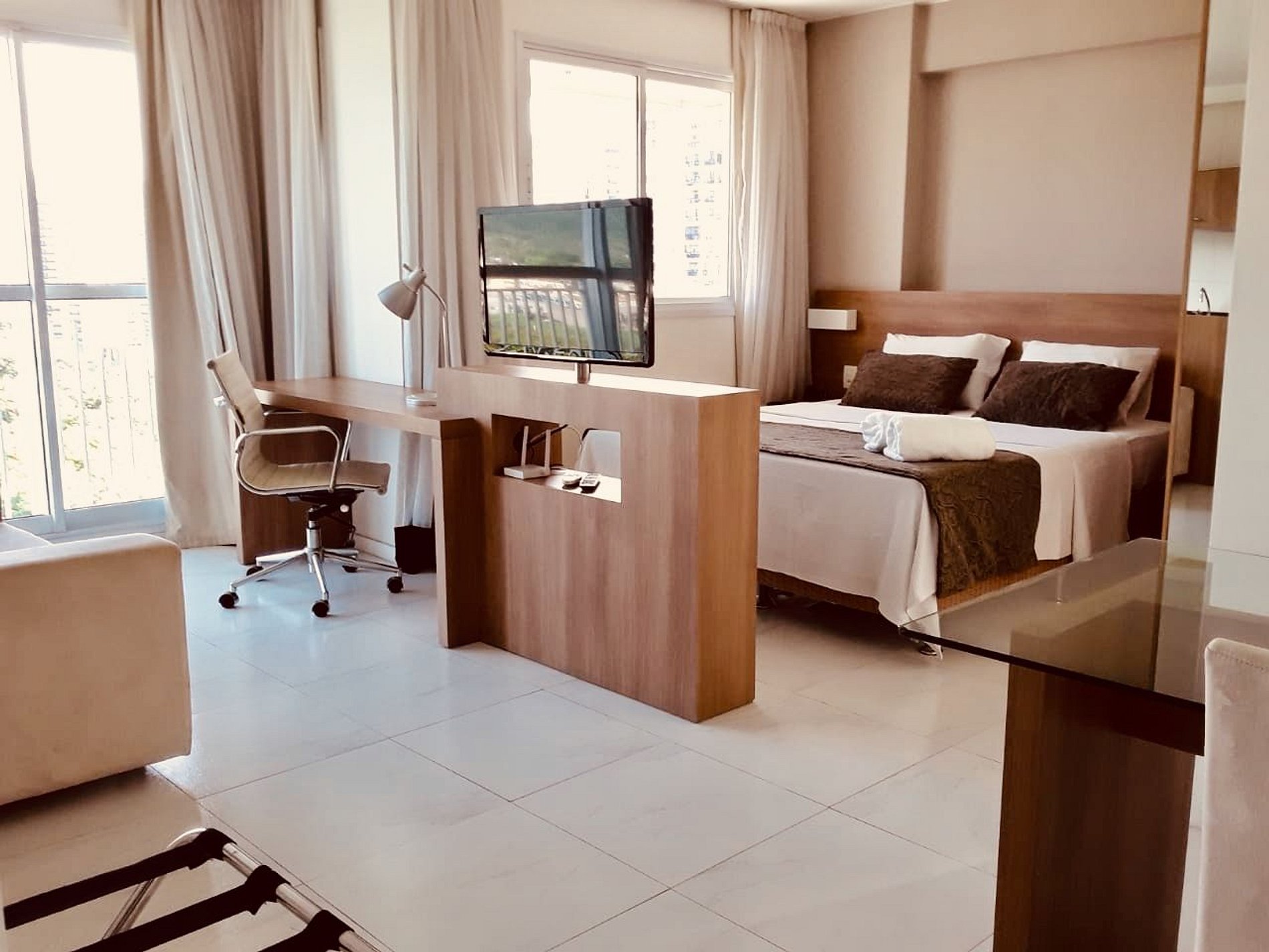 Flat moderno, funcional, equipado e bastante confortável. Excelente para trabalho e relaxar.