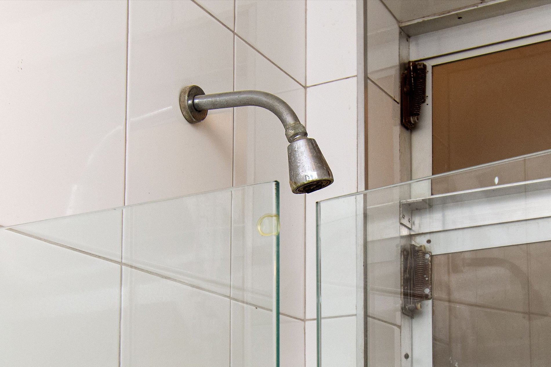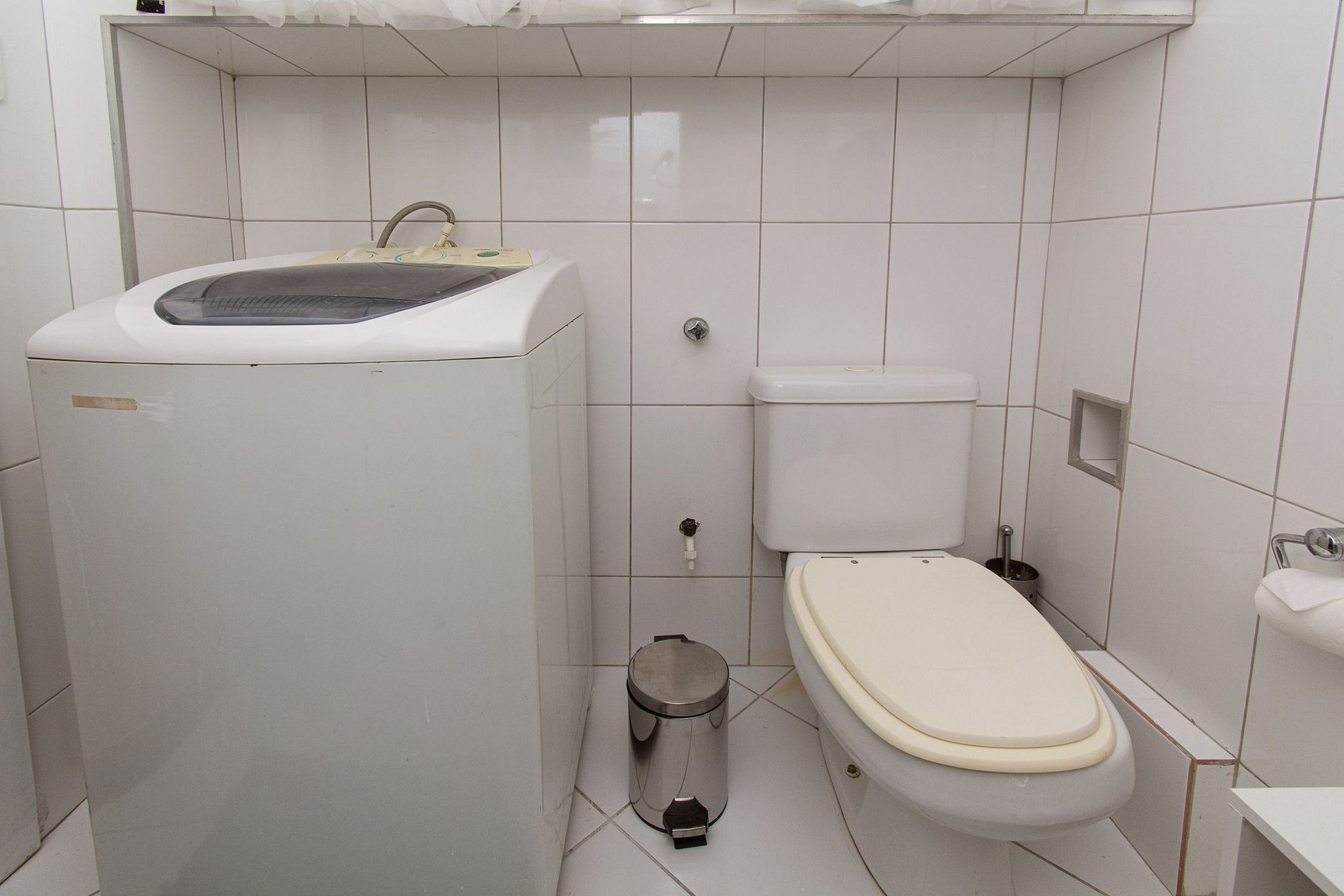 Banheiro completo com box, chuveiro, água quente e máquina de lavar roupa.