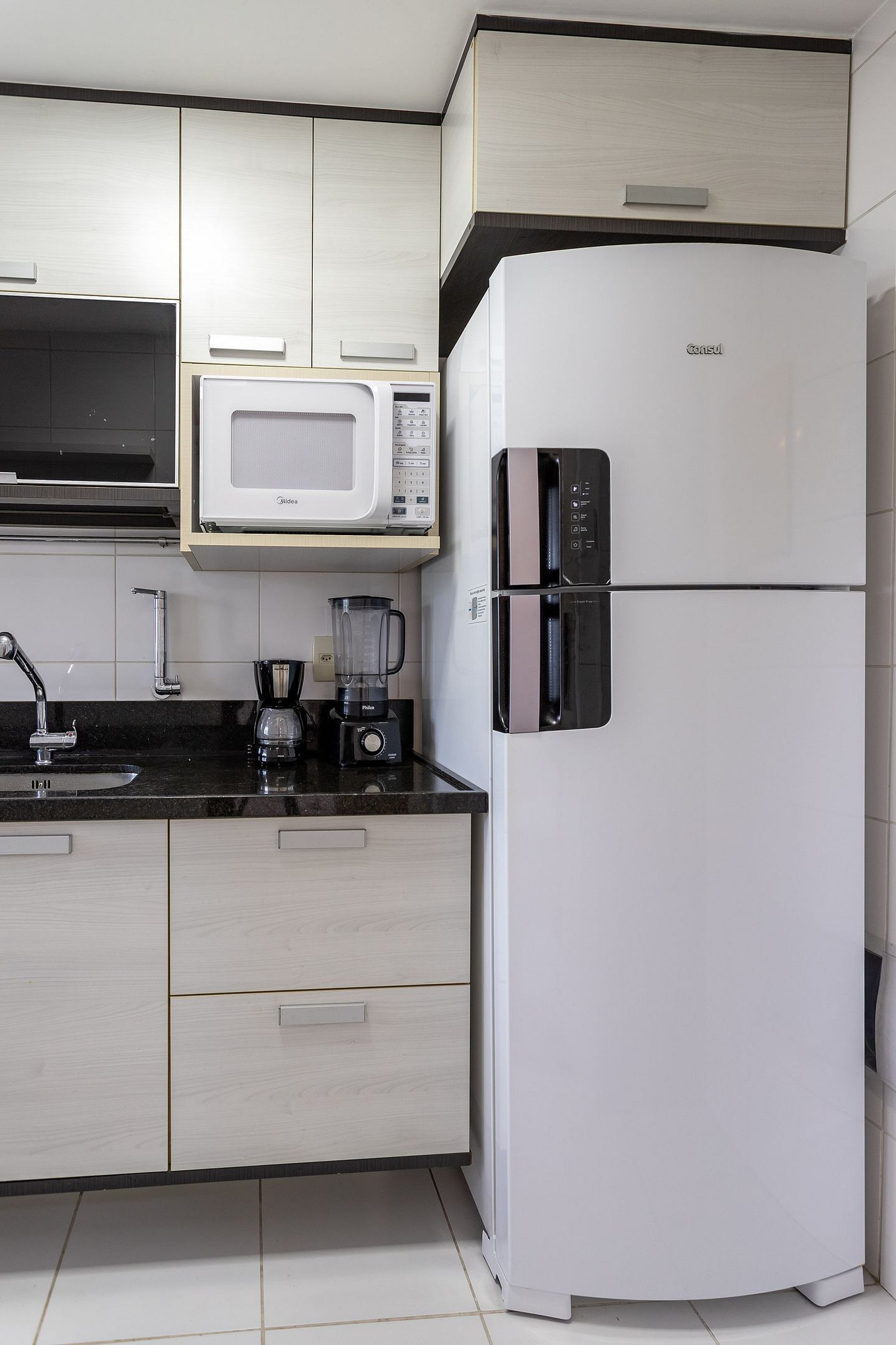 Cozinha completa, com microondas, cafeteira, sanduicheira, filtro de água, liquidificador, utensílios novos, louças, panelas novas, todos os eletrodomésticos são recém comprados.
