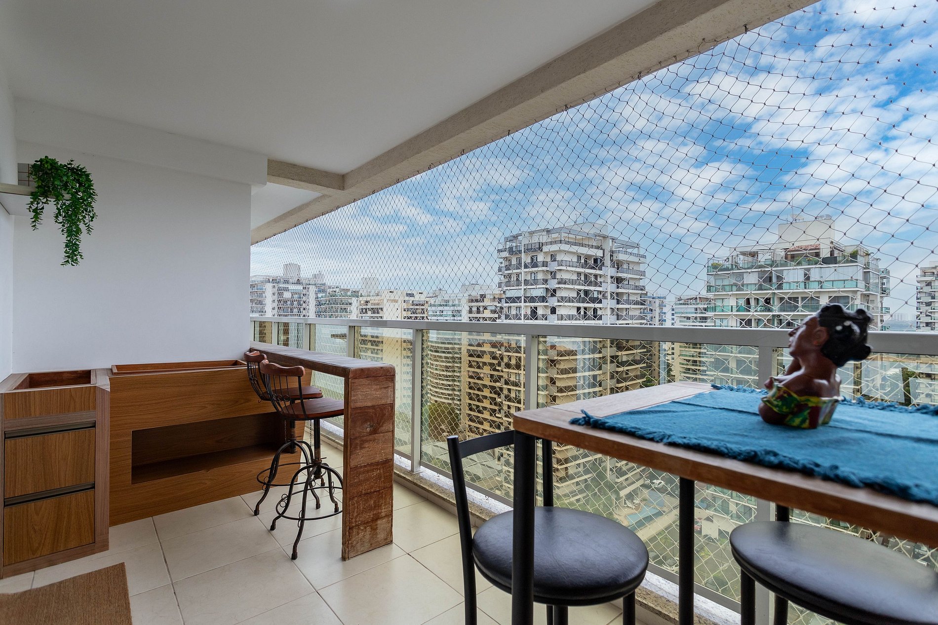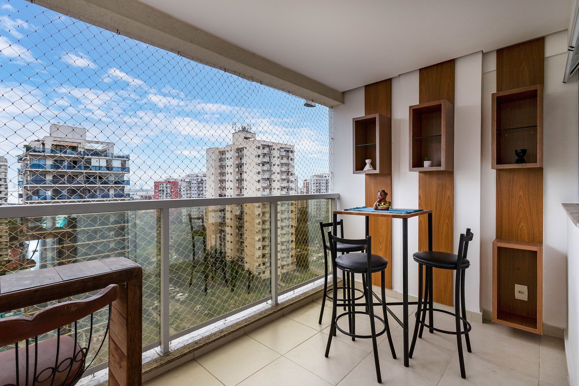 O destaque do apartamento é a varanda, com uma vista livre, sensacional, andar alto, com tela de proteção, mesa e cadeiras. Excelente lugar para apreciar a vista, relaxar e bater papo com os amigos e família.
