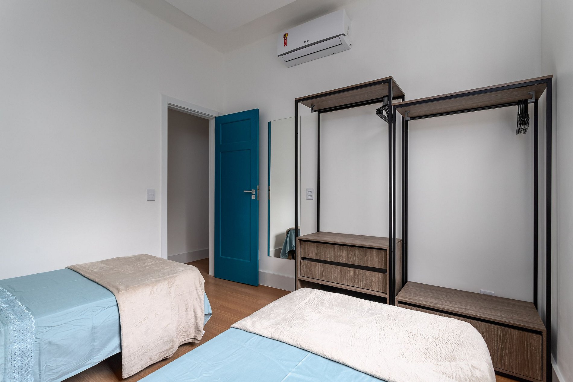 2º Quarto possui duas camas de solteiro, armário estilo aberto, mesinha de cabeceira com luminária, ar split e janelas com persianas black out.