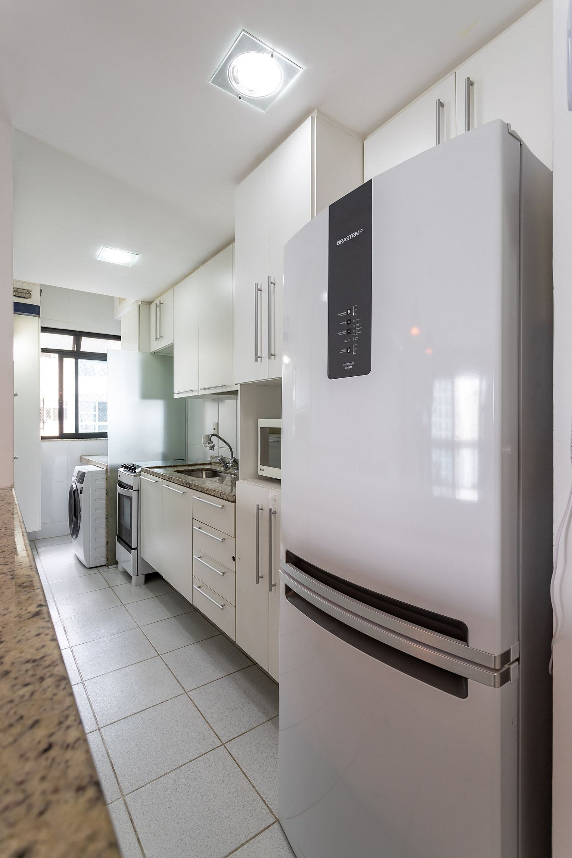 Cozinha: Fogão, geladeira, microondas, máquina de lavar e armários. Cafeteira, sanduicheira, liquidificador, panelas e utensílios de cozinha.