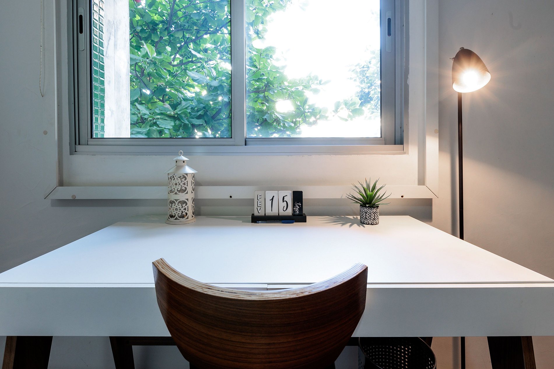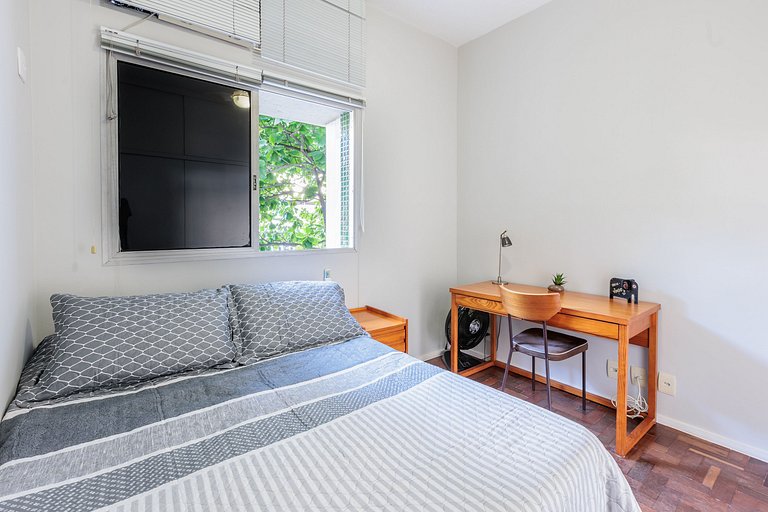 - Primeiro quarto com cama de casal padrão confortável, com armário e mesa adequada para home office, ar condicionado e ventilador de teto, black out nas janelas.