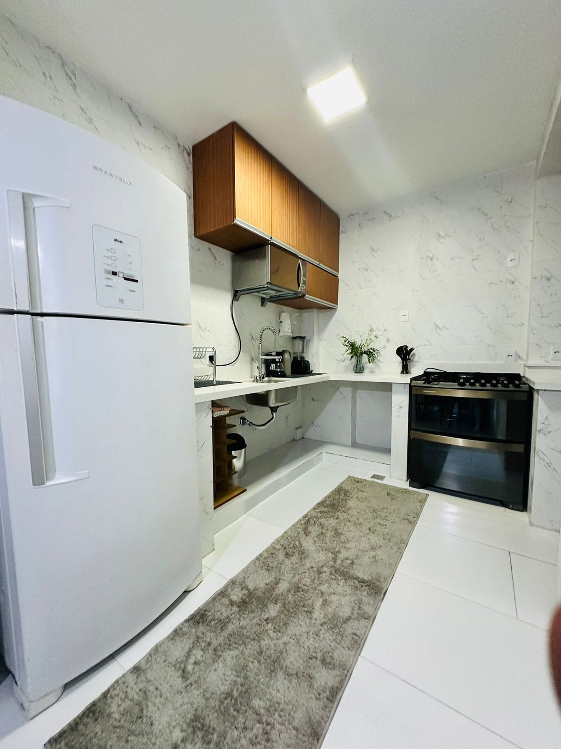 Cozinha completa com eletrodomésticos, microondas, fogão, geladeira, liquidificador, cafeteira , utensílios de cozinha. Não oferecemos forno.