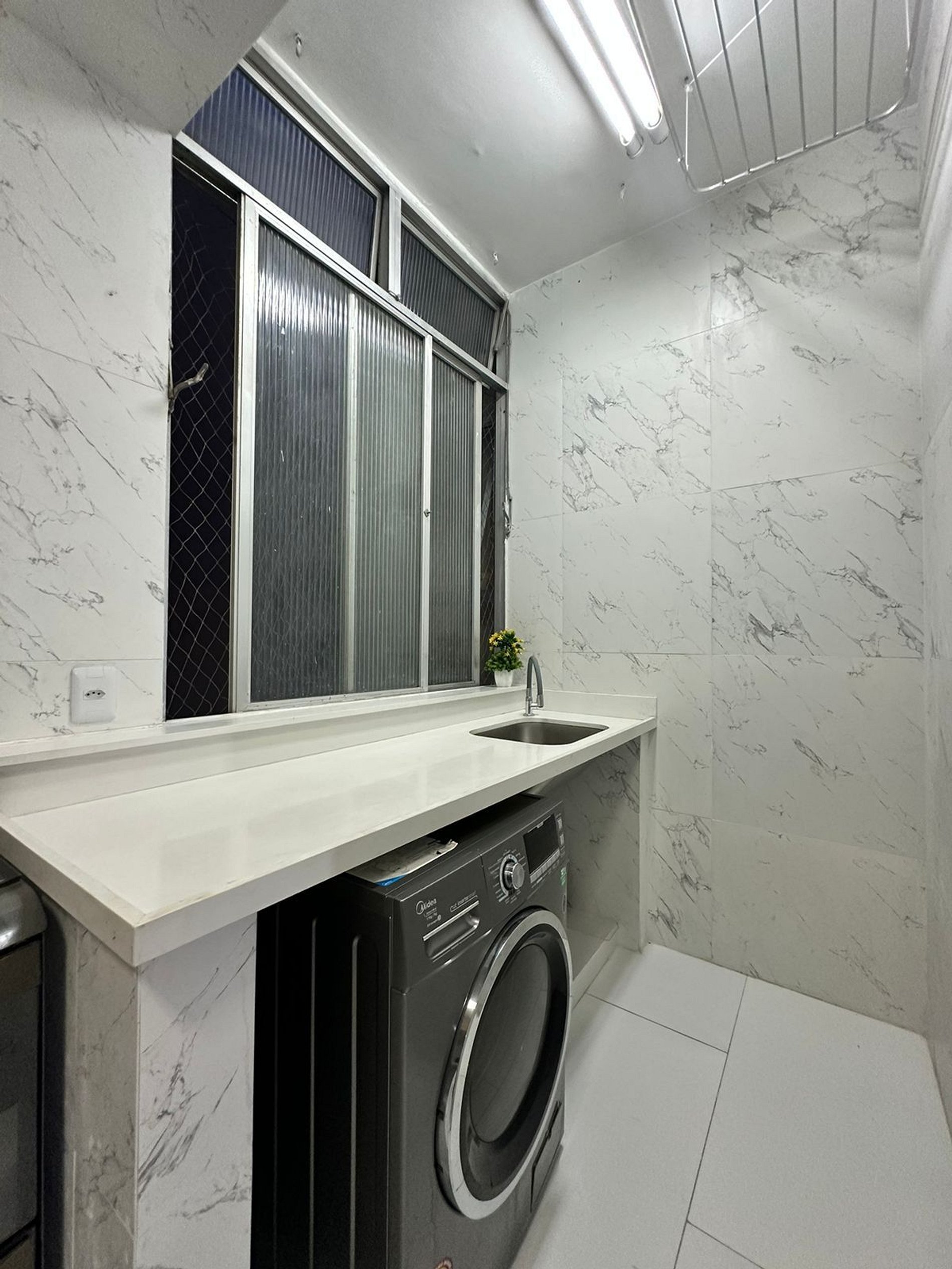 Área de serviço com máquina de lavar roupa e tanque.