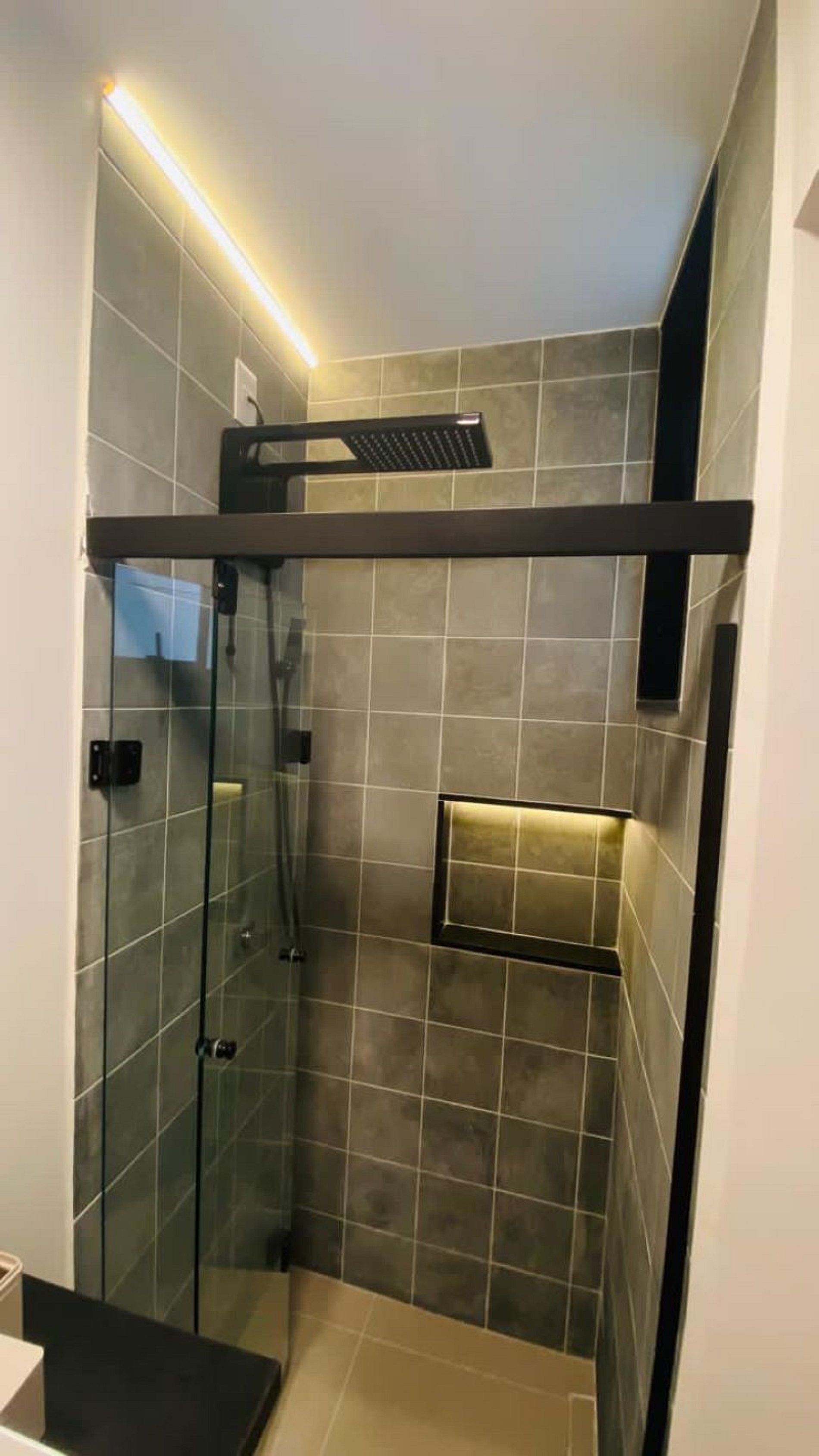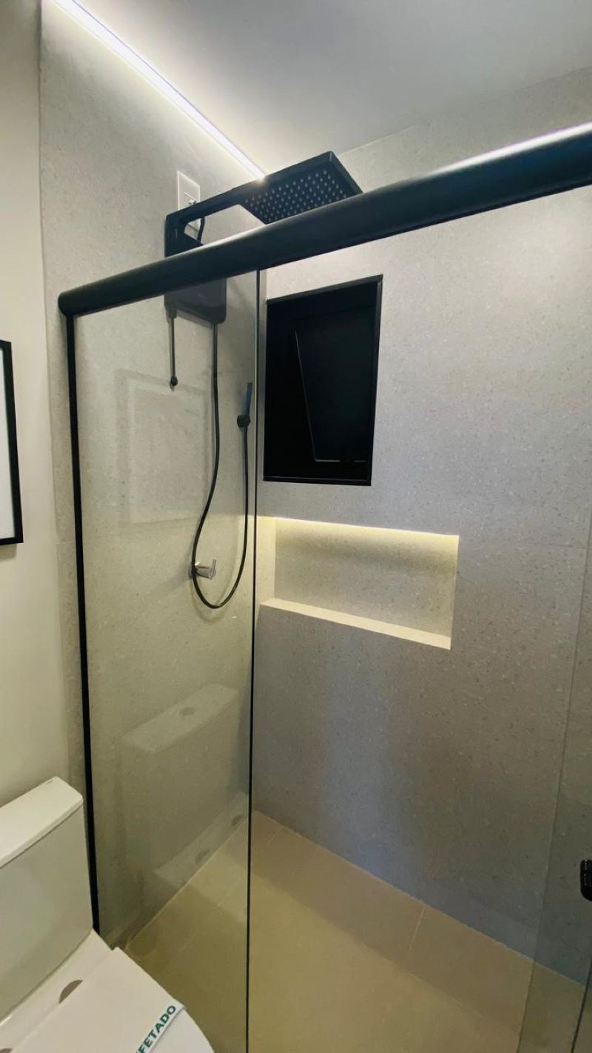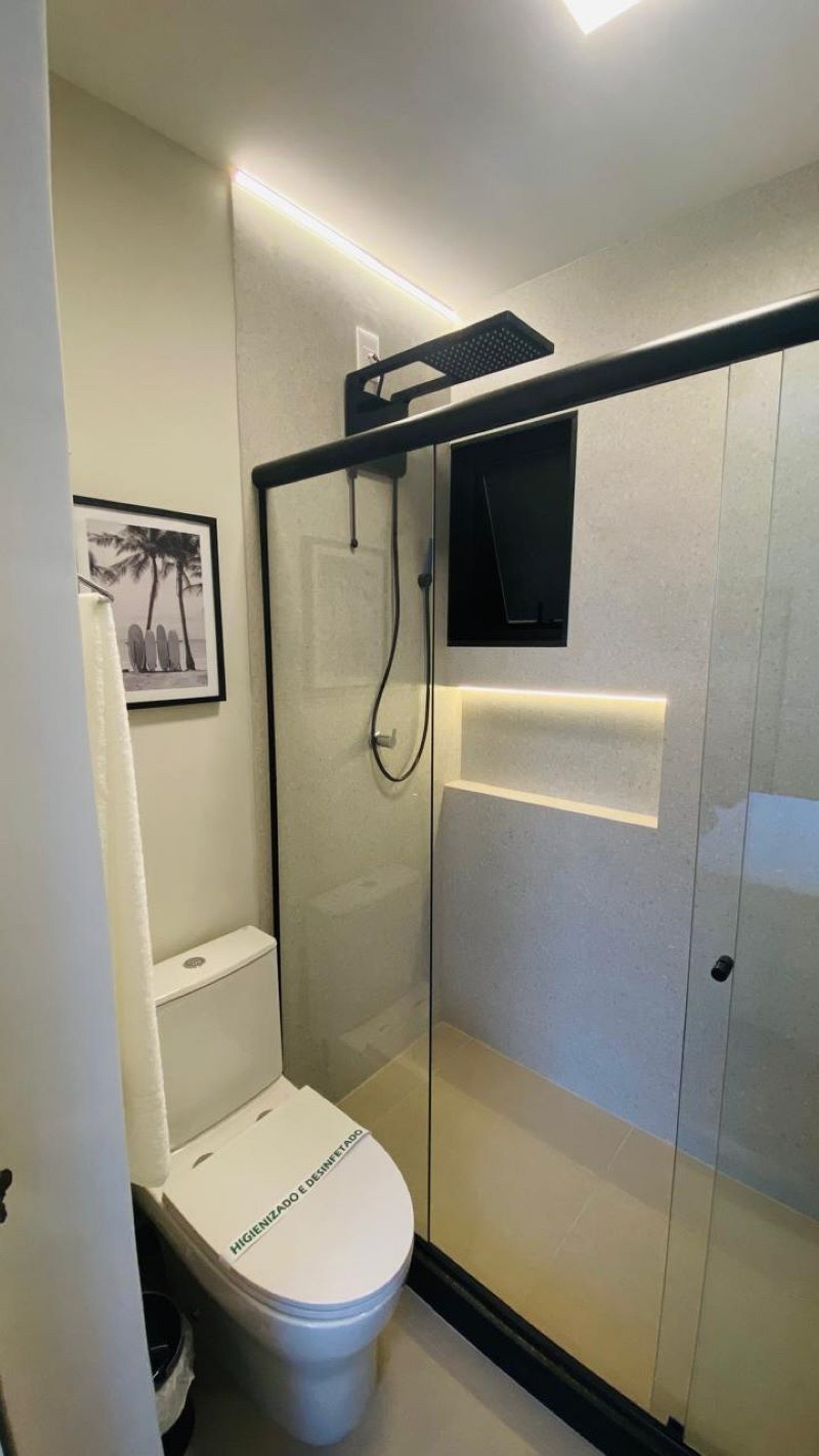 1º Quarto de casal possui cama de casal Queen, armário estilo aberto, mesa de trabalho/estudo, ar split, suíte reformada com chuveiro, box blindex, janelas com persianas black out.