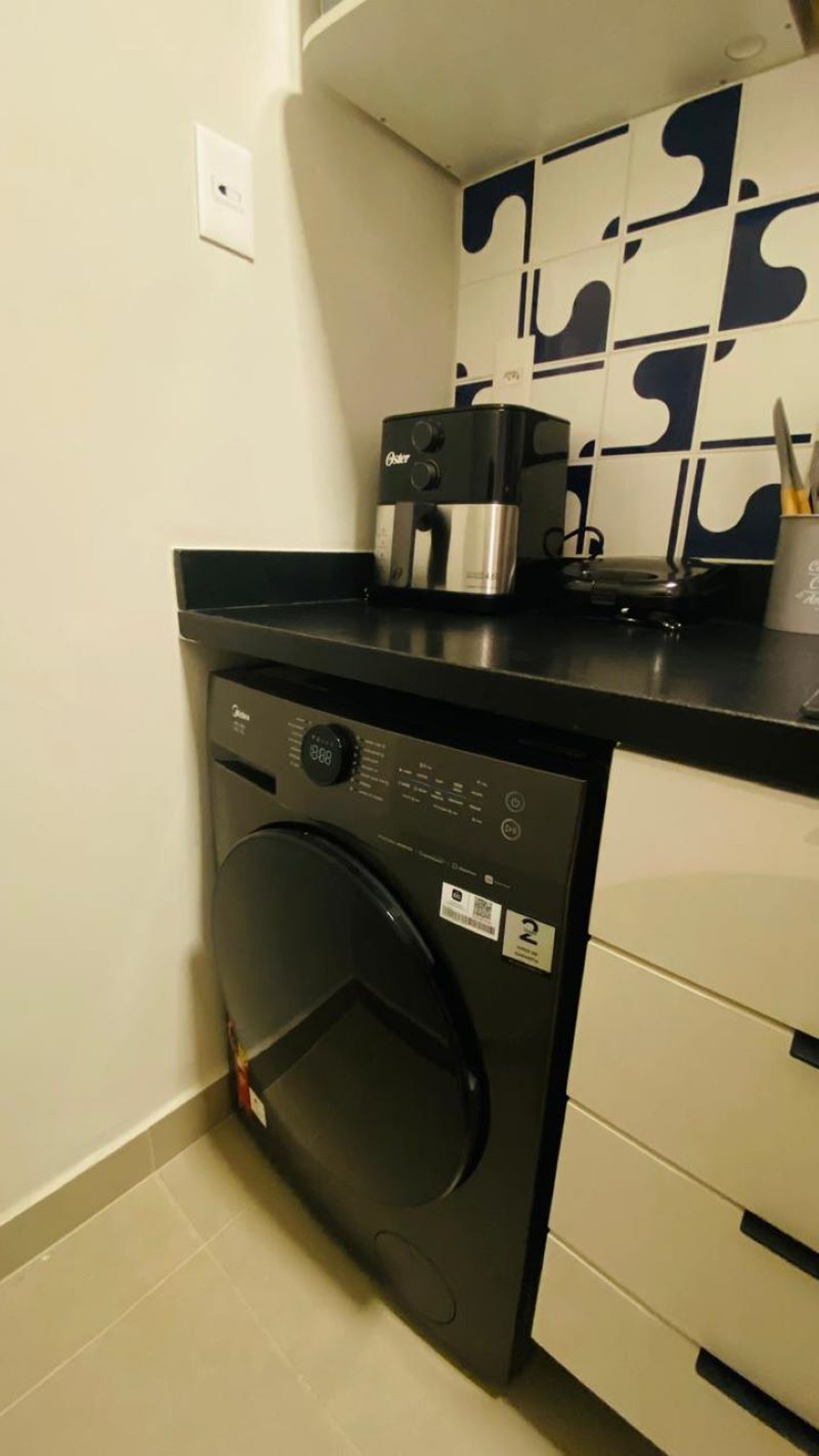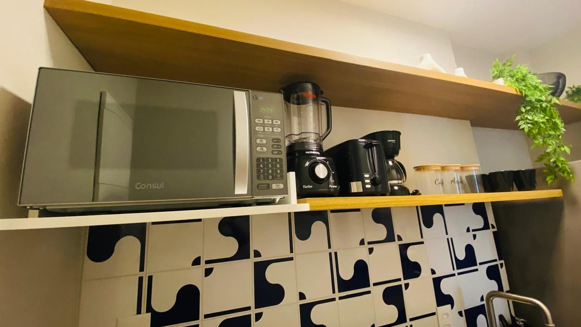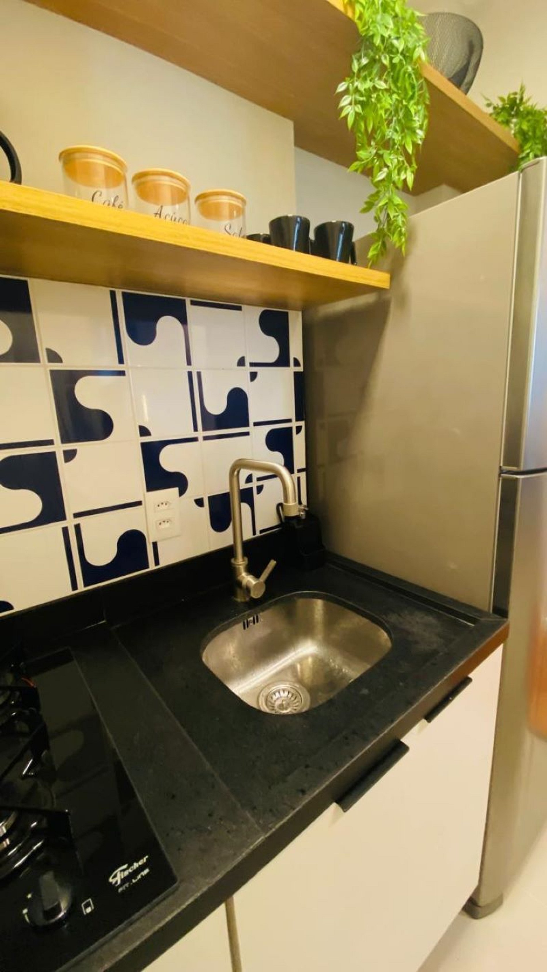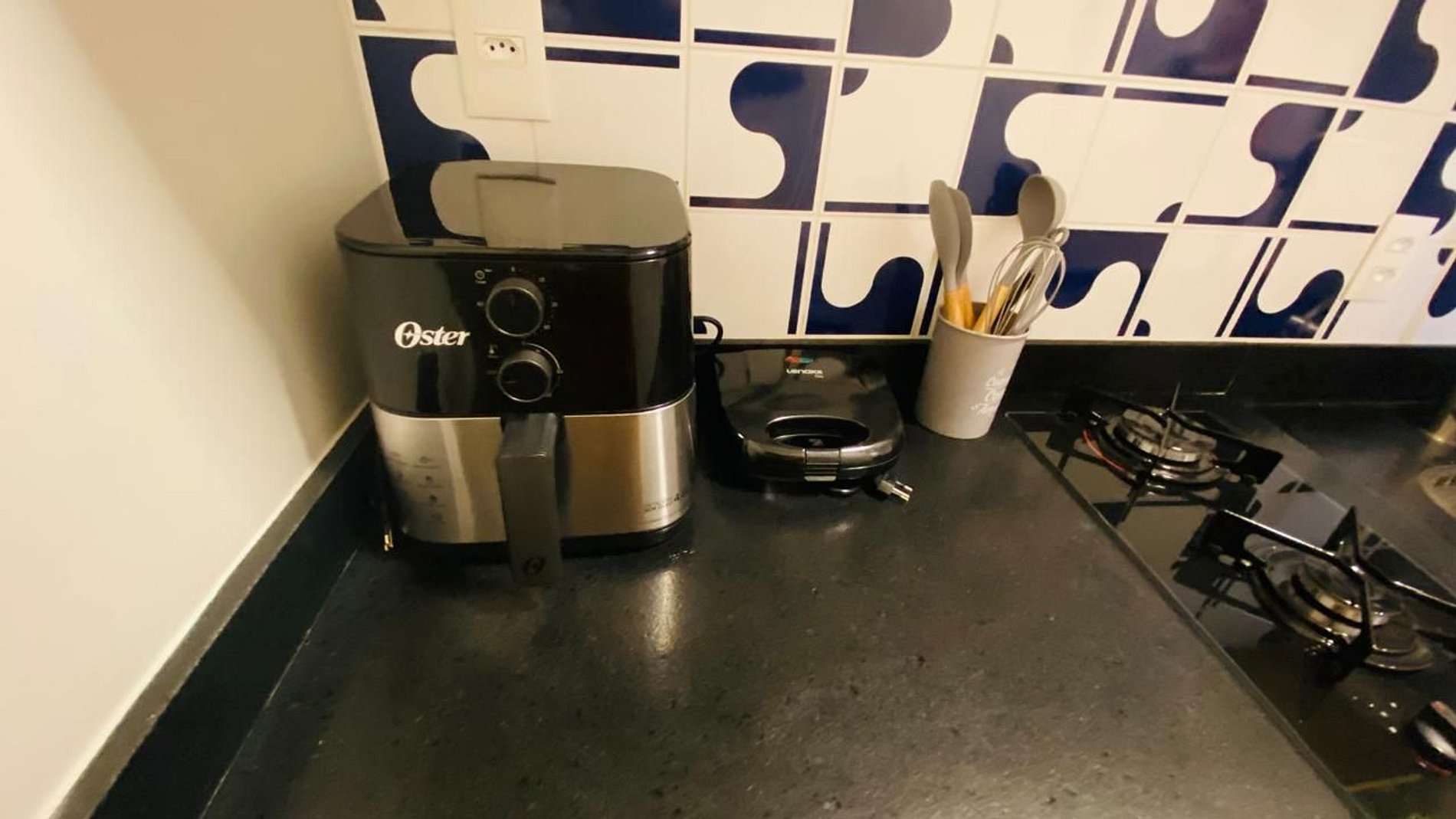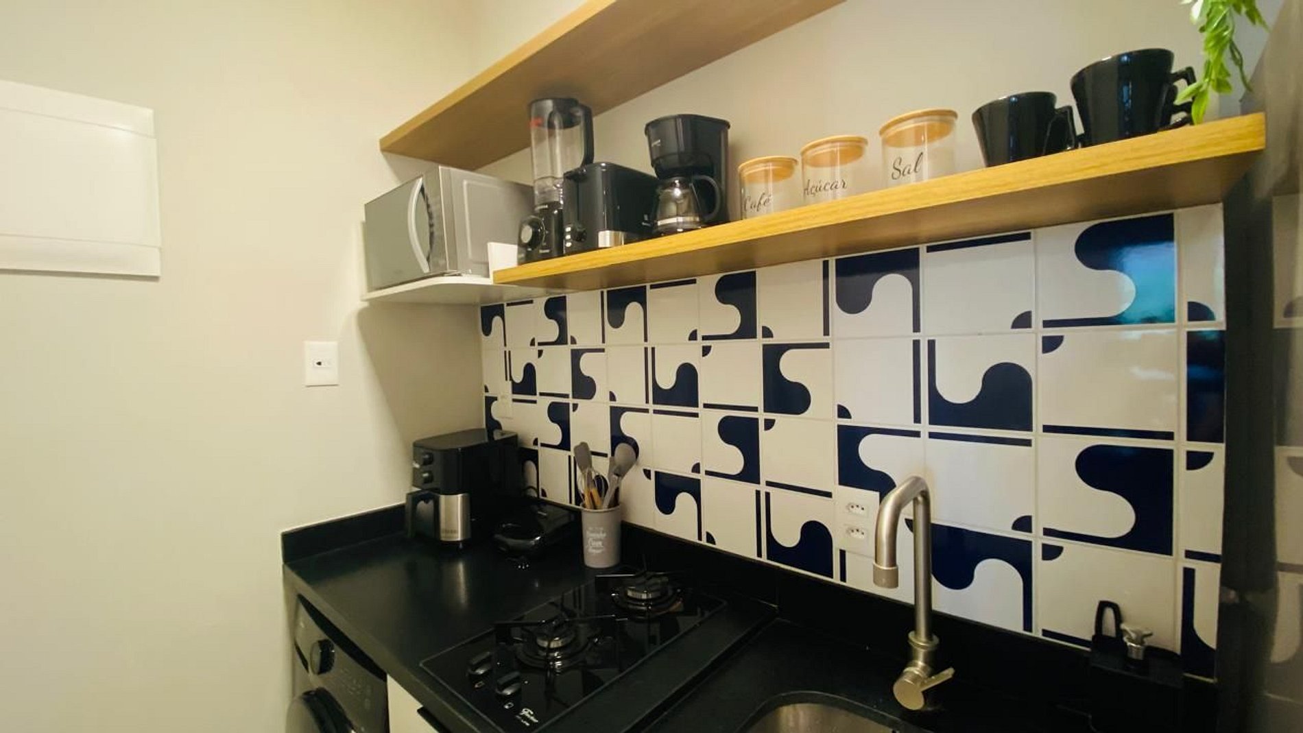 Cozinha completa integrada à sala, com eletrodomésticos, microondas, coocktop, geladeira, sanduicheira, cafeteira , airfryer, utensílios de cozinha. Não oferecemos forno.