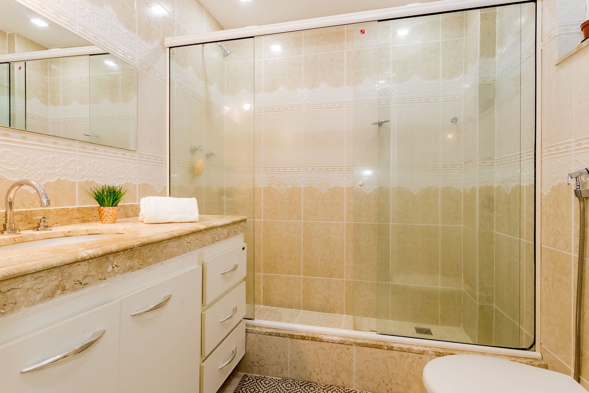 Banheiro no corredor completo com chuveiro, box blindex.
