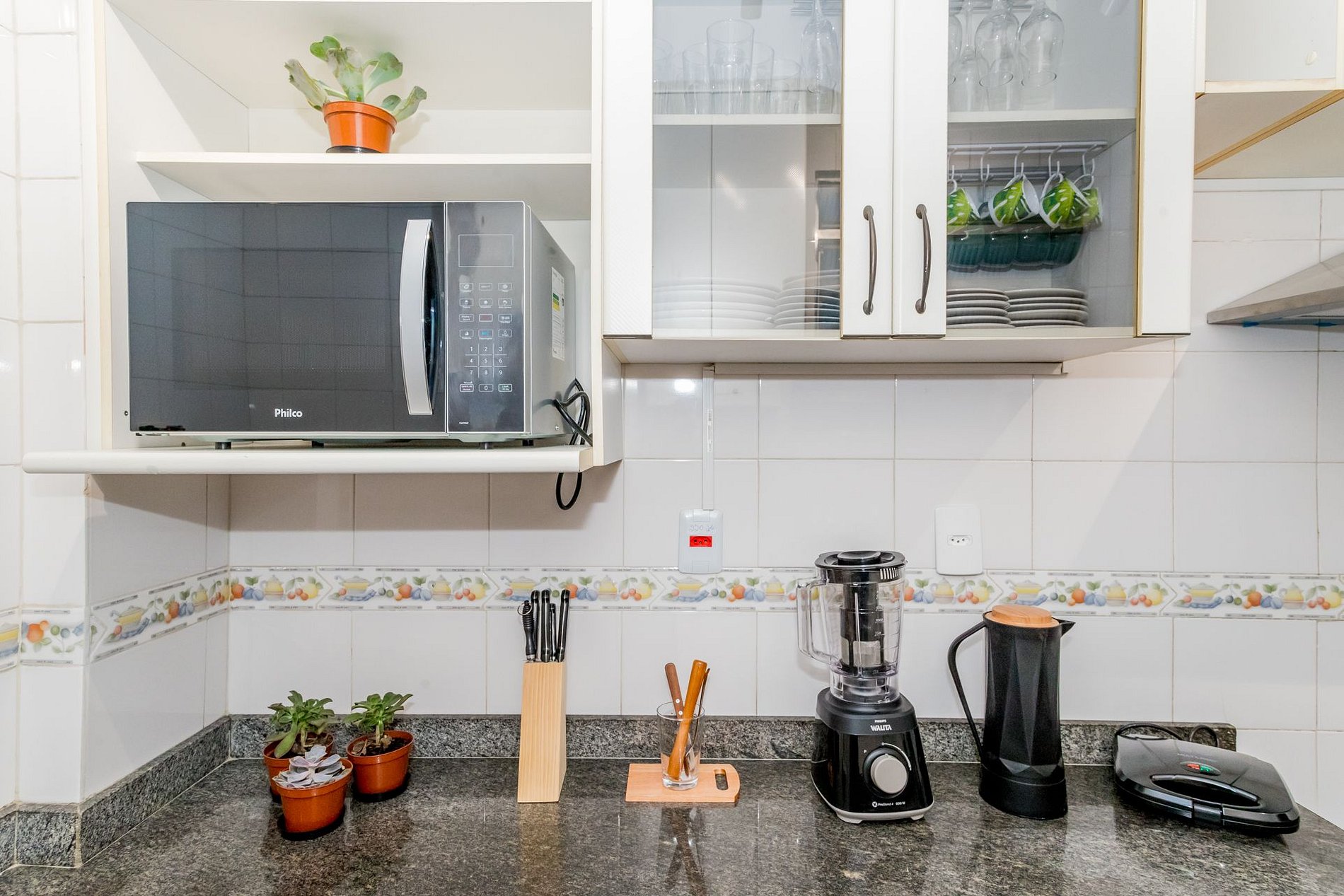 Cozinha completa com eletrodomésticos e utensílios (todos novos), tais como: microondas, fogão/forno, geladeira, sanduicheira, utensílios de cozinha, pratos, talheres, taças, panelas, tábuas, tudo com excelente nível de qualidade, sempre pensando no seu bem estar, da sua família e amigos.