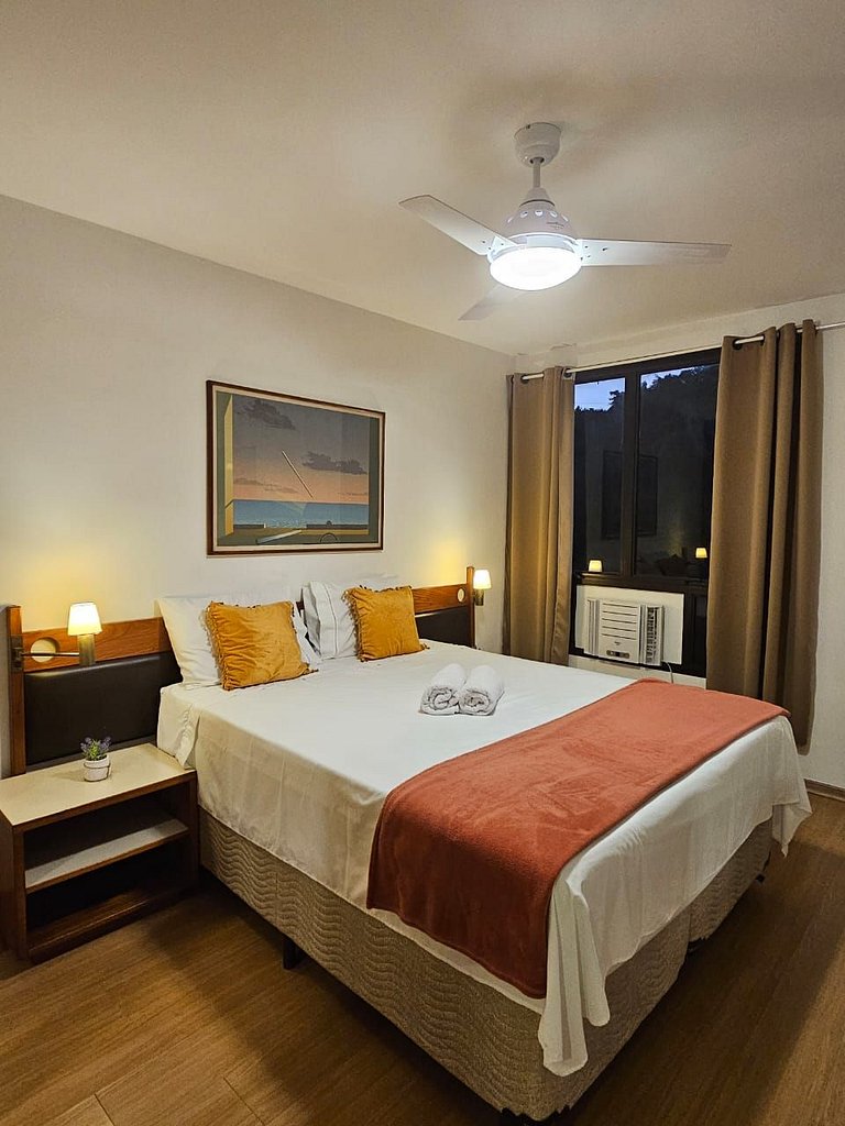 - Quarto com cama de casal confortável, armário, ar condicionado, ventilador de teto, TV SMART.