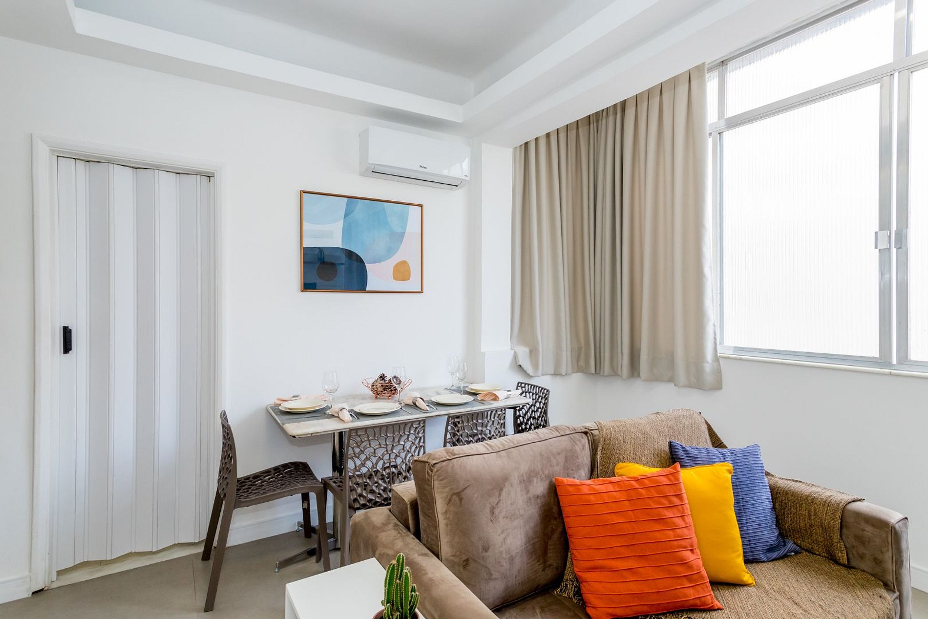 O apartamento é funcional, um aconchego único, tem tudo que você precisa para passar dias tranquilos no conhecido e movimentado bairro de Copacabana. Local seguro, prédio residencial, localizado exatamente atrás do famoso e requintado Hotel Belmond Copacabana Palace e a uma quadra da praia de Copacabana, apenas 150 metros de distância. Tudo na sala e no quarto é novo, inclusive os ares splits. Embaixo do prédio, tem uma deliciosa cafeteria. Muitos restaurantes, bares, floriculturas, pizzarias, farmácias na redondeza, você faz tudo a pé. Metrô colado no apartamento.