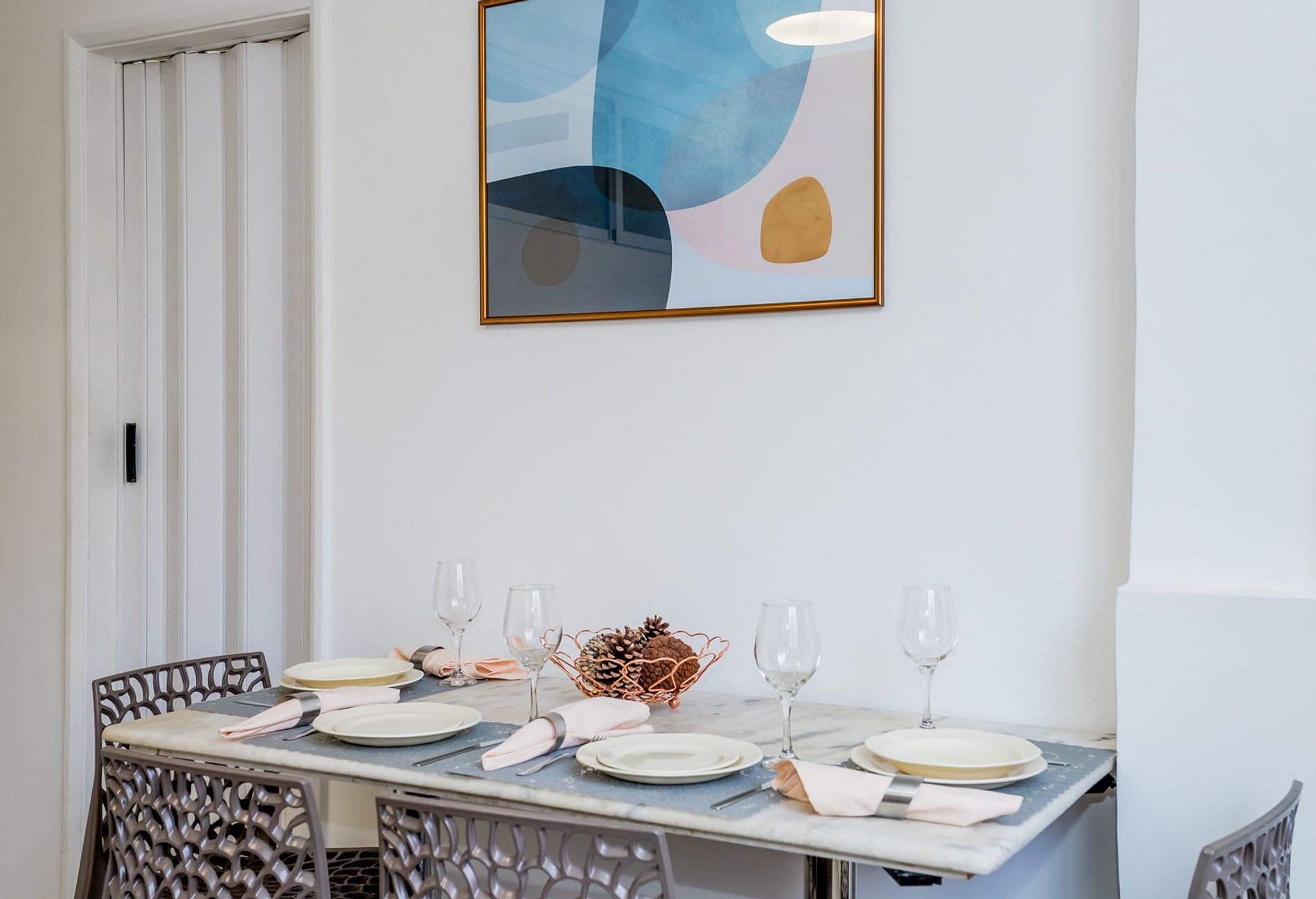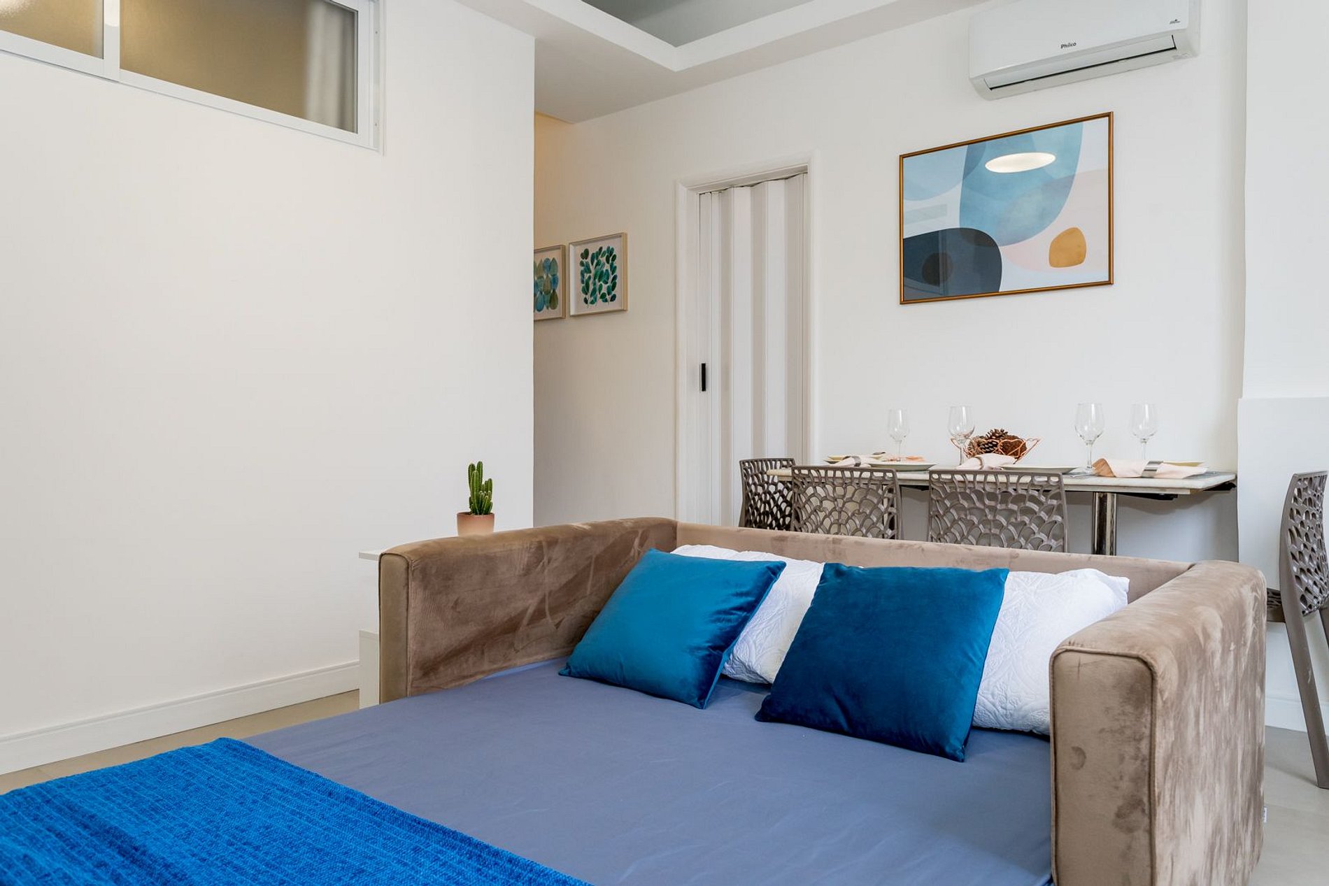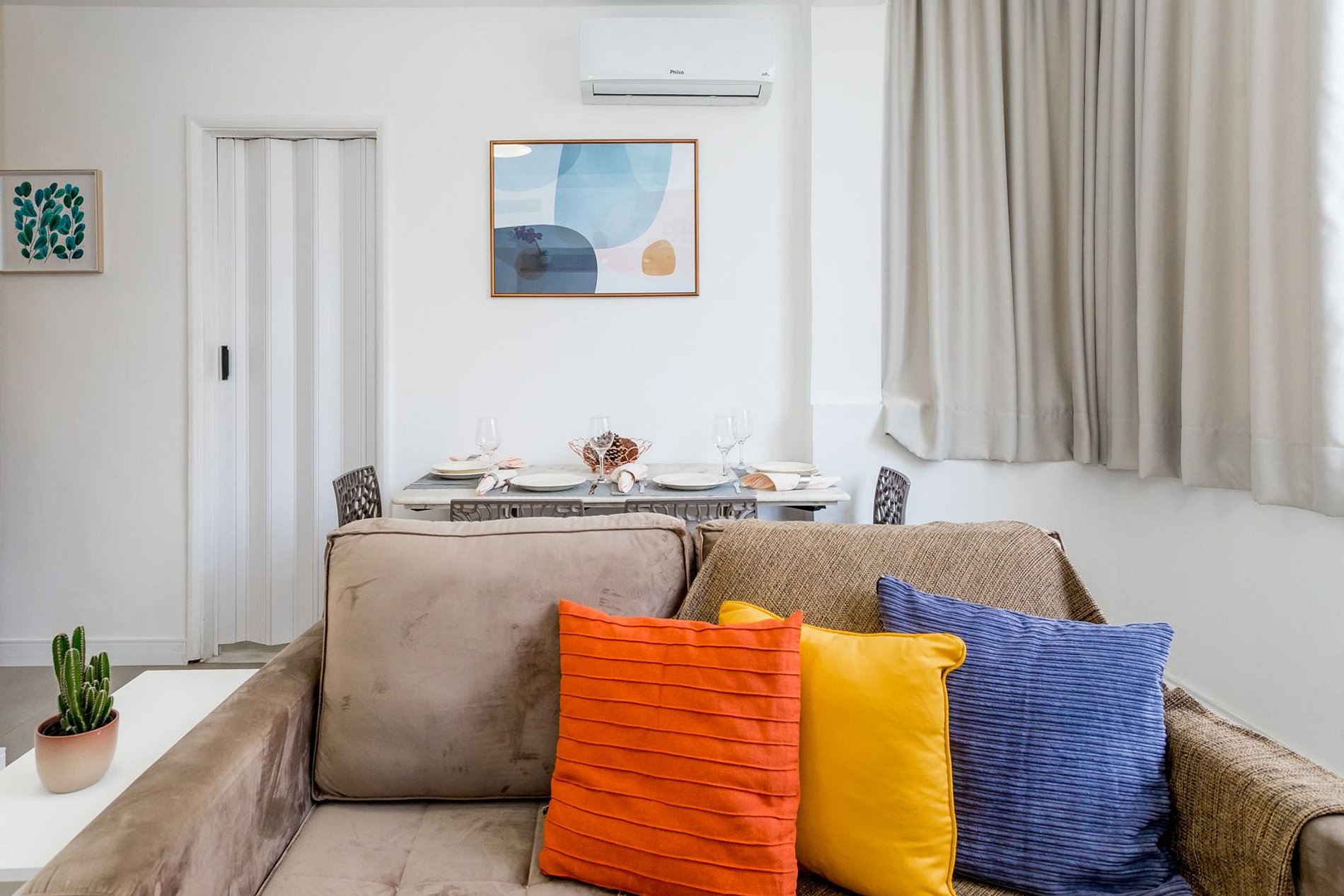 Sala com SOFÁ-CAMA de casal confortável, com SMART TV com canais abertos, wi fi de 350 Mb, mesa de jantar/Home Office para 4 pessoas e ar split NOVO.