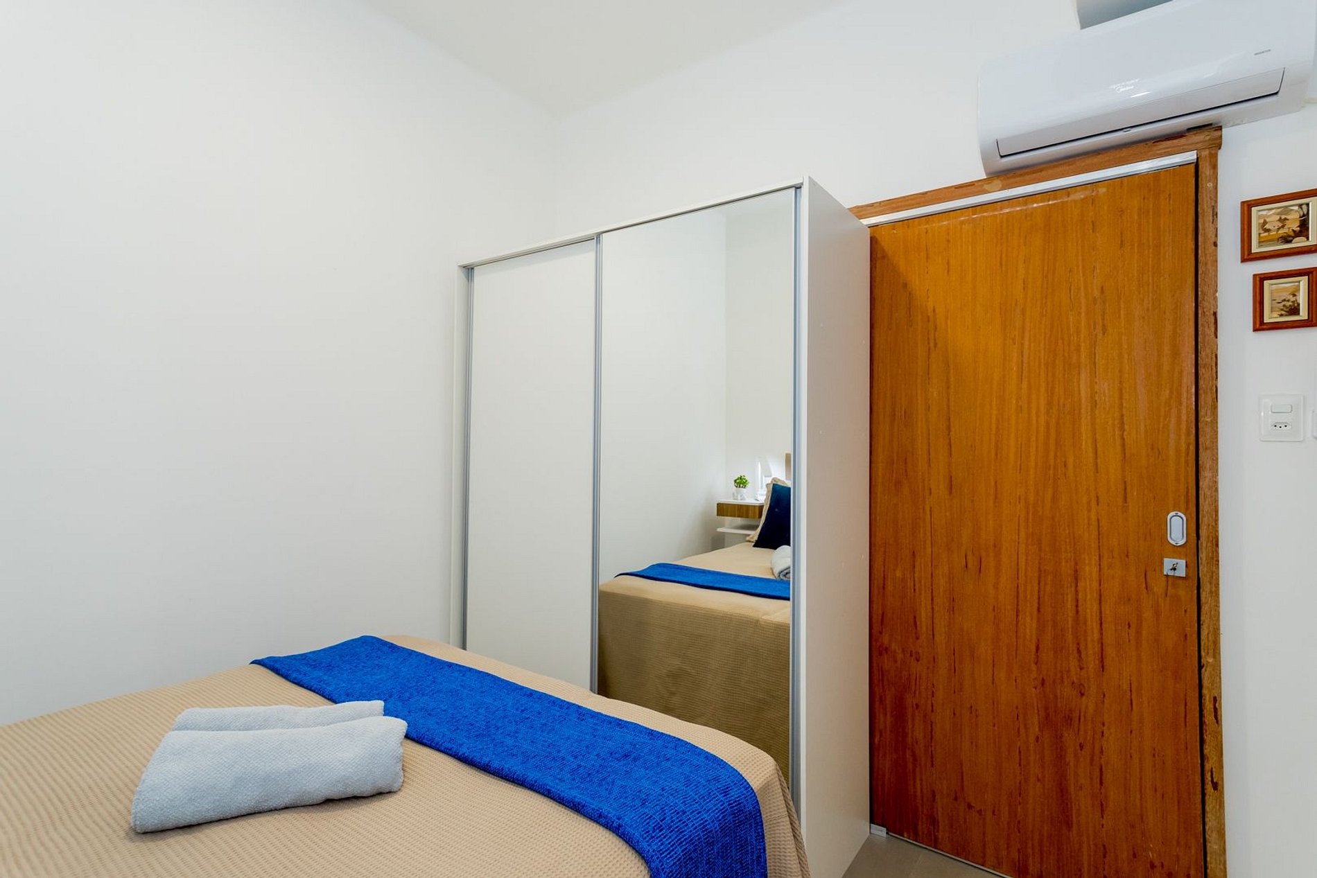 O Quarto de casal possui cama de casal padrão, armário, ar split NOVO, janela com cortina black out.