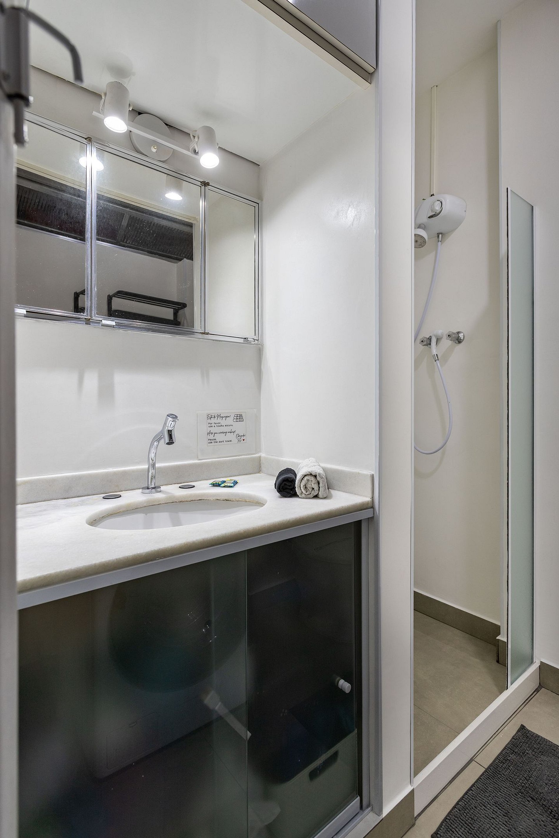 Banheiro completo com box, chuveiro, agua quente, secador de cabelo.