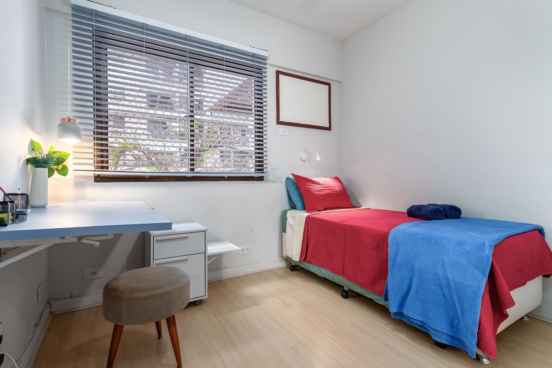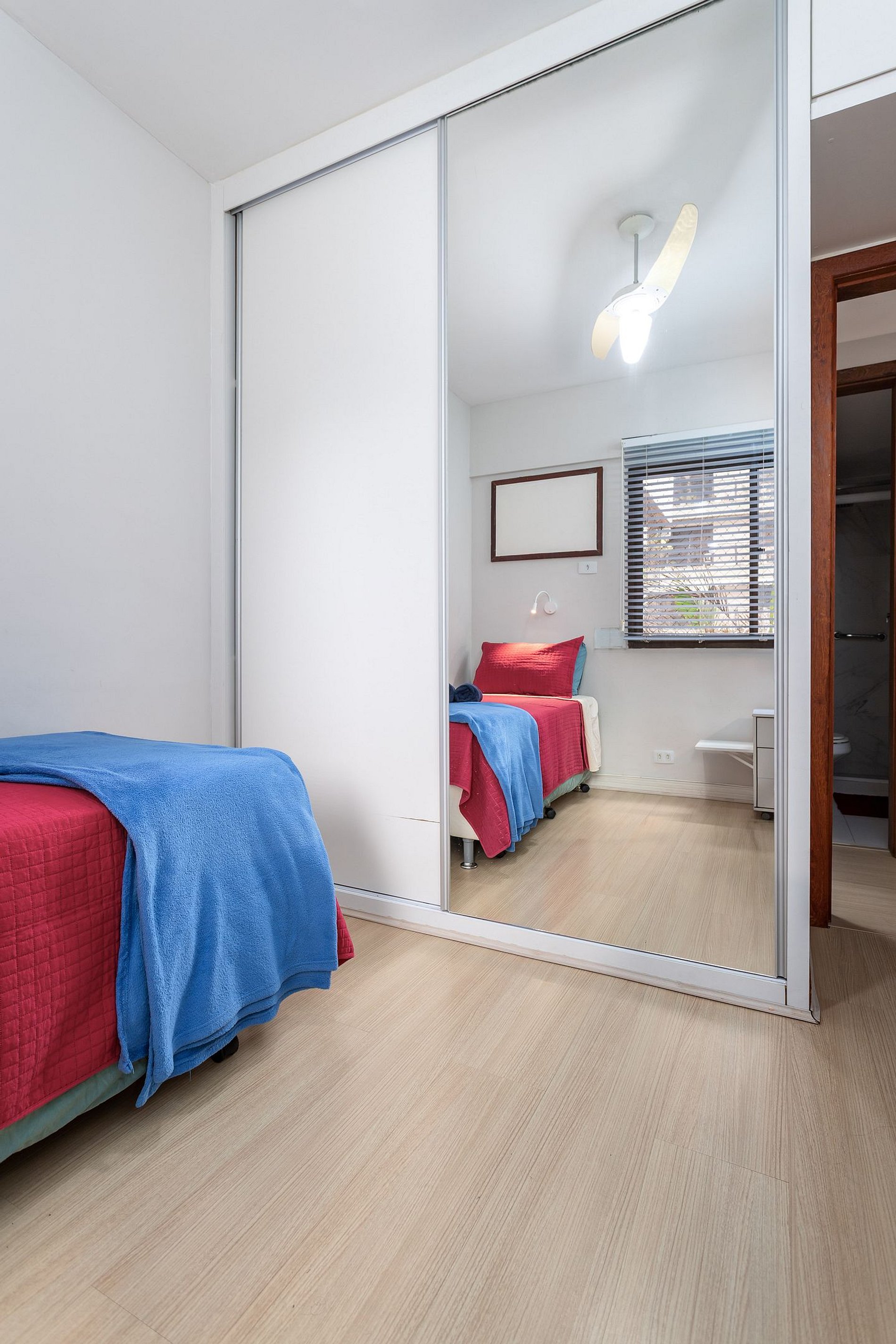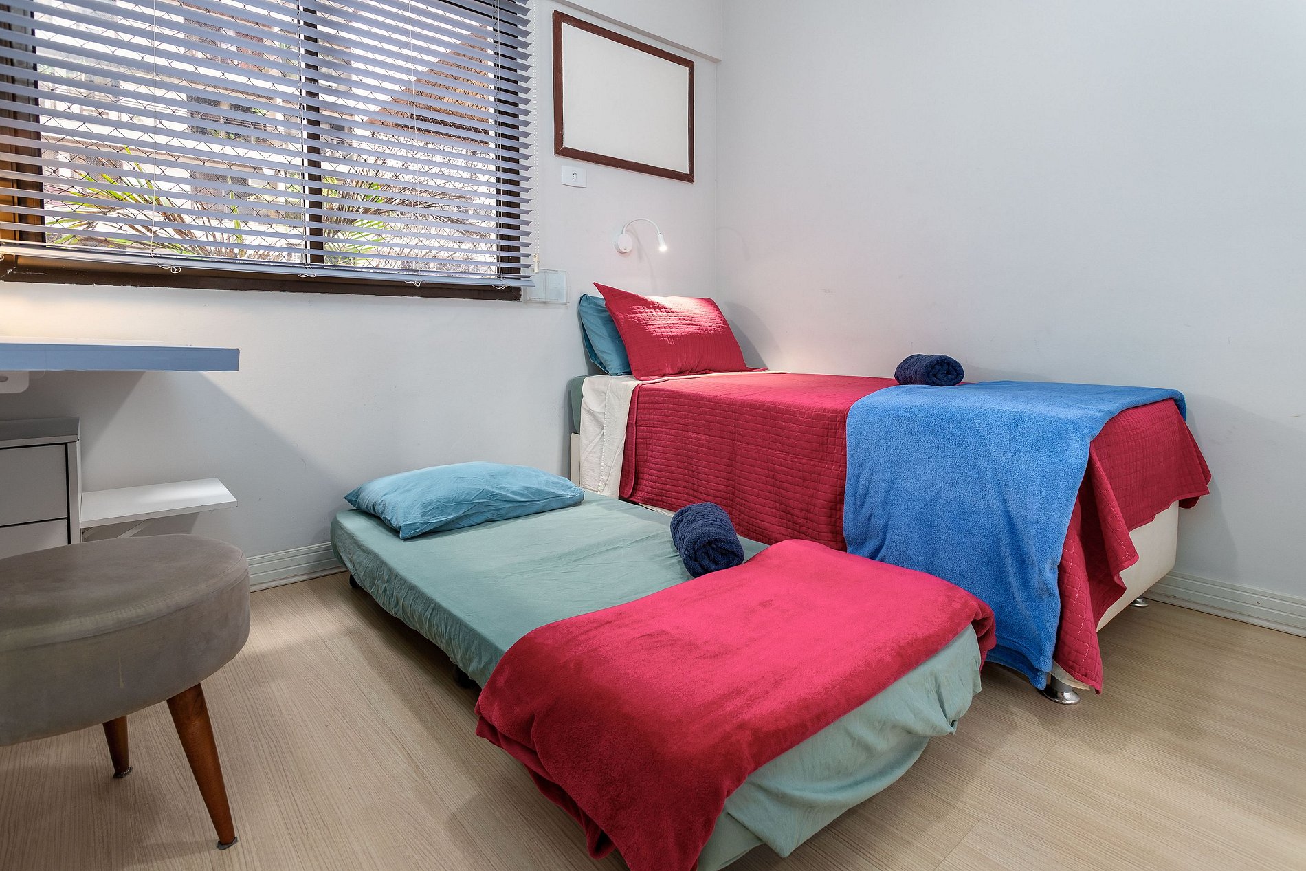 - Quarto com bi cama de solteiro, armário, ventilador de teto, mesa para home office. A cama debaixo é menor que a de cima, recomendamos que uma pessoa menor durma nela. Este quarto não tem ar, somente ventilador de teto.