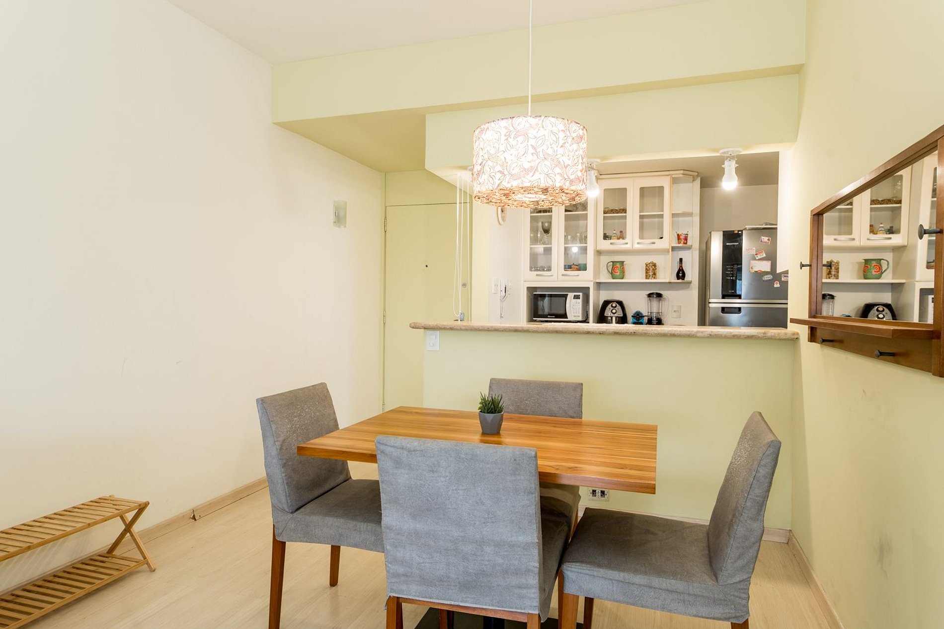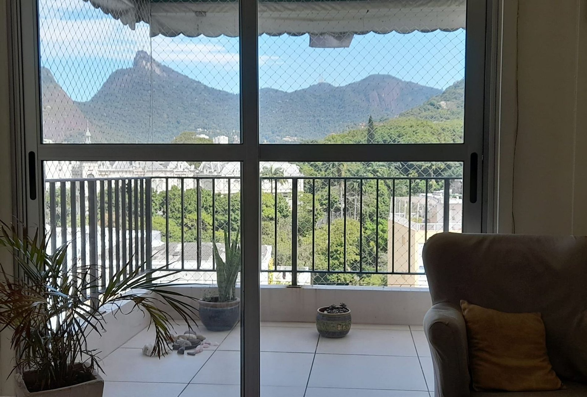 O apartamento possui sala de estar e jantar com mesa para 4 pessoas, o sofá da sala se transforma em sofá cama e acomoda bem 1 pessoa, varanda com vista livre para o Cristo, 2 quartos com ar condicionado, 2 banheiros, cozinha completa e área de serviço, com máquina de lavar roupa. Estacionamento coberto gratuito para 1 carro.