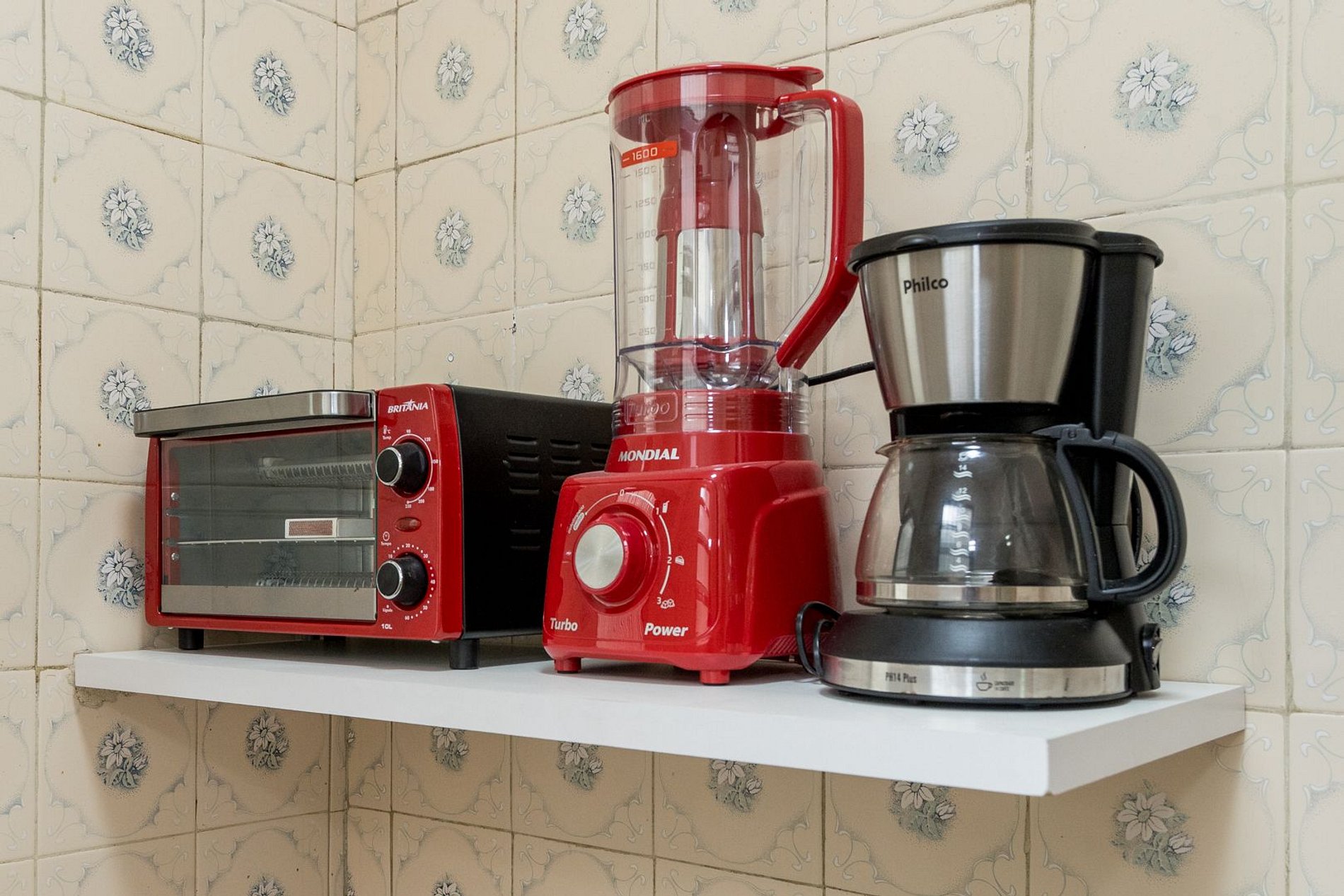 Cozinha completa com eletrodomésticos, louças, microondas, fogão e forno, geladeira, forninho elétrico, cafeteira , utensílios de cozinha básicos.