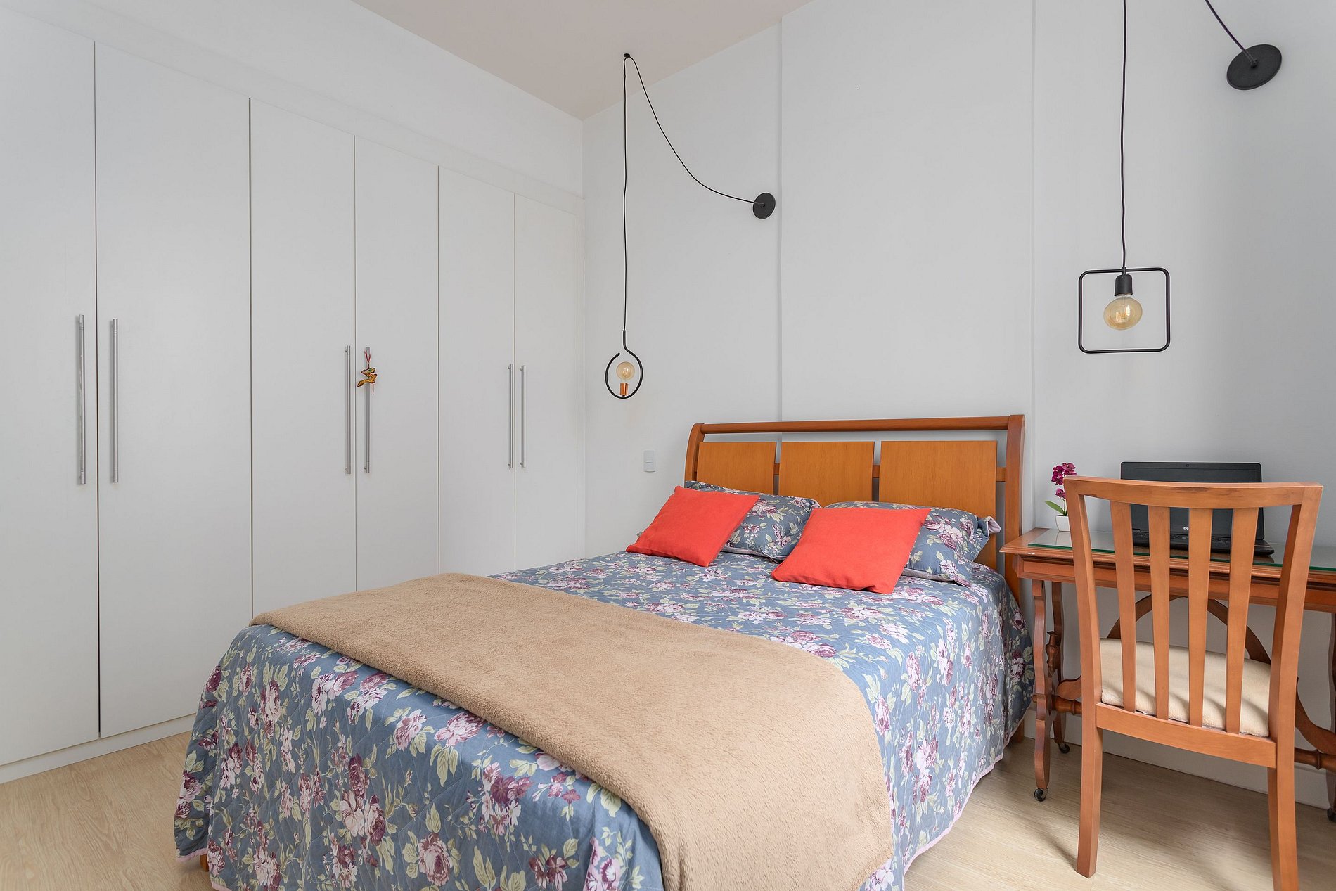 1º Quarto de casal possui cama de casal, armários, black out nas cortinas, espaço/mesa para home office e estudos, ar split e ventilador de teto.