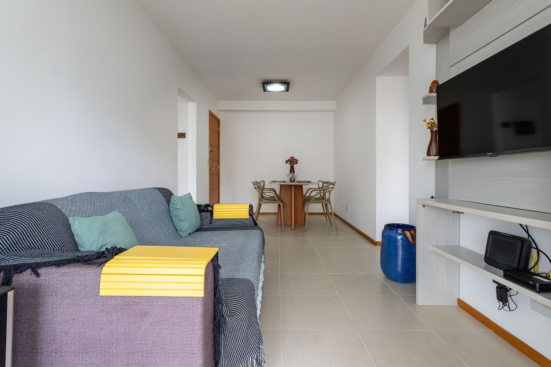 Sala ampla com sofá retrátil, podendo transformar em cama de casal (lembrando que é um sofá cama), smart TV SMART, com canais a cabo da VIVO, streamings como: Netflix, GLOBOPLAY, YOUTUBE (traga a sua senha), mesa de jantar para 4 pessoas, acesso a Wi-fi. Ventilador de chão. tela de proteção na varanda.