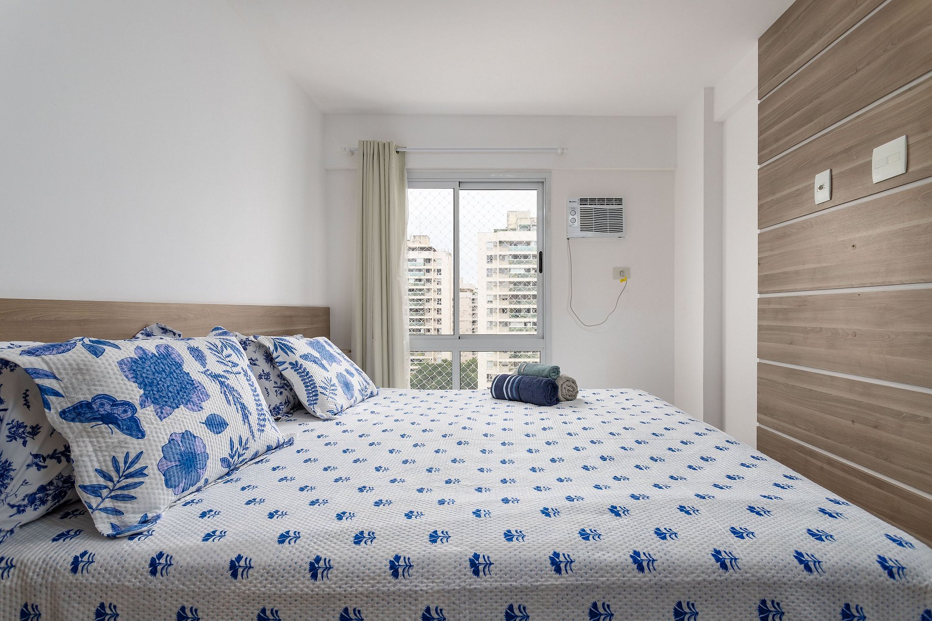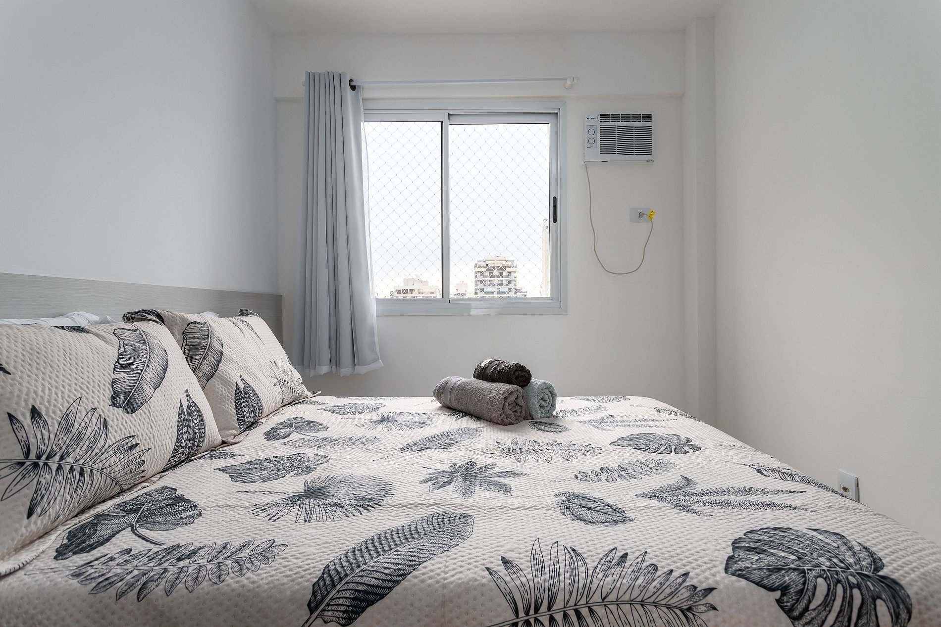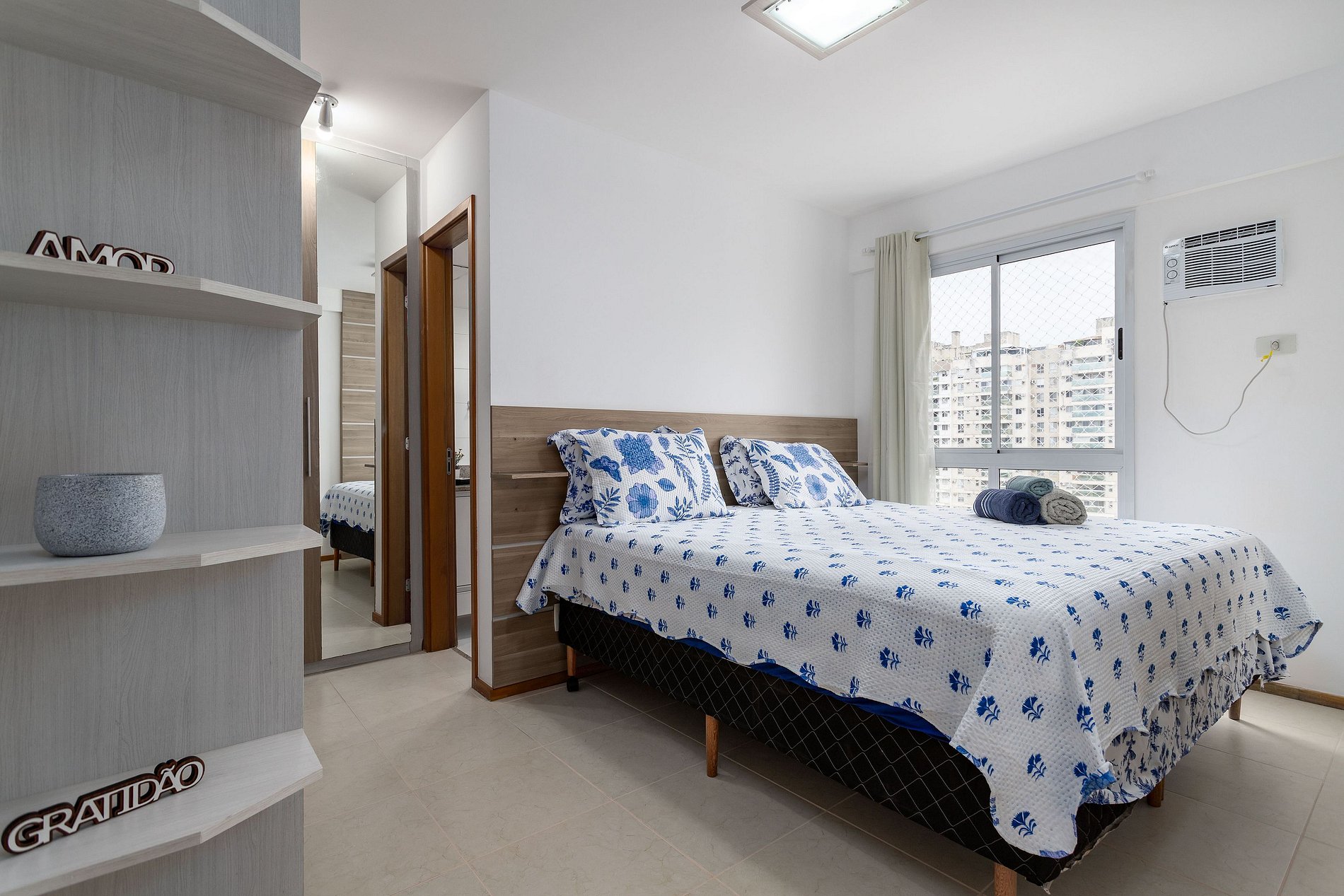 Composto por 1 suíte com cama casal King, armário, cortina, ar condicionado e tela de proteção na janela.