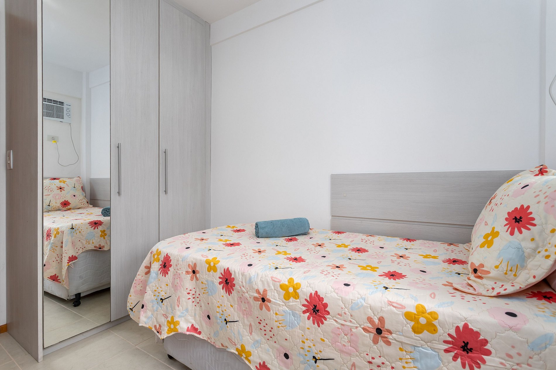 Terceiro quarto com duas camas de solteiro,cortina, armário, ar condicionado e tela de proteção na janela.