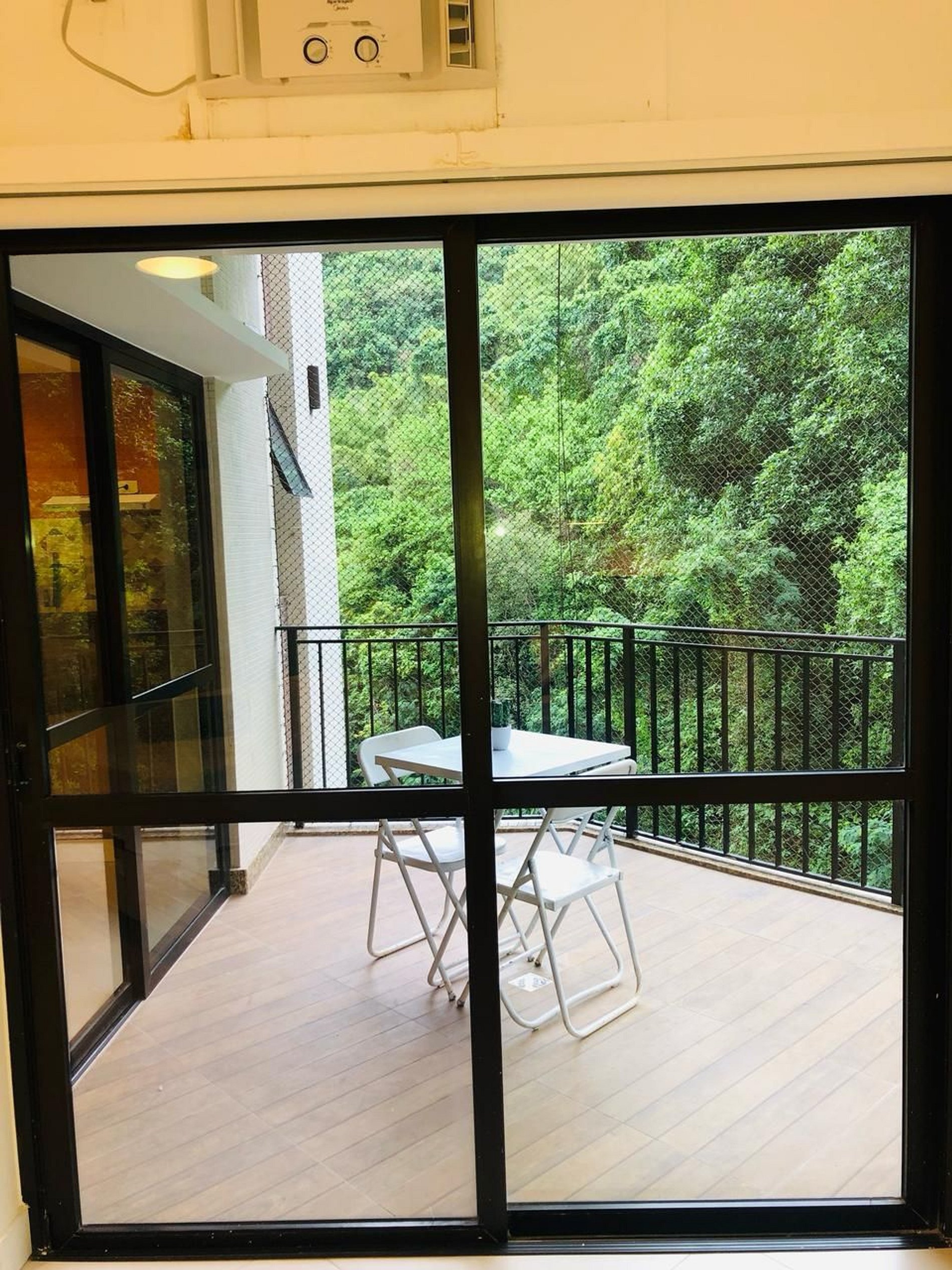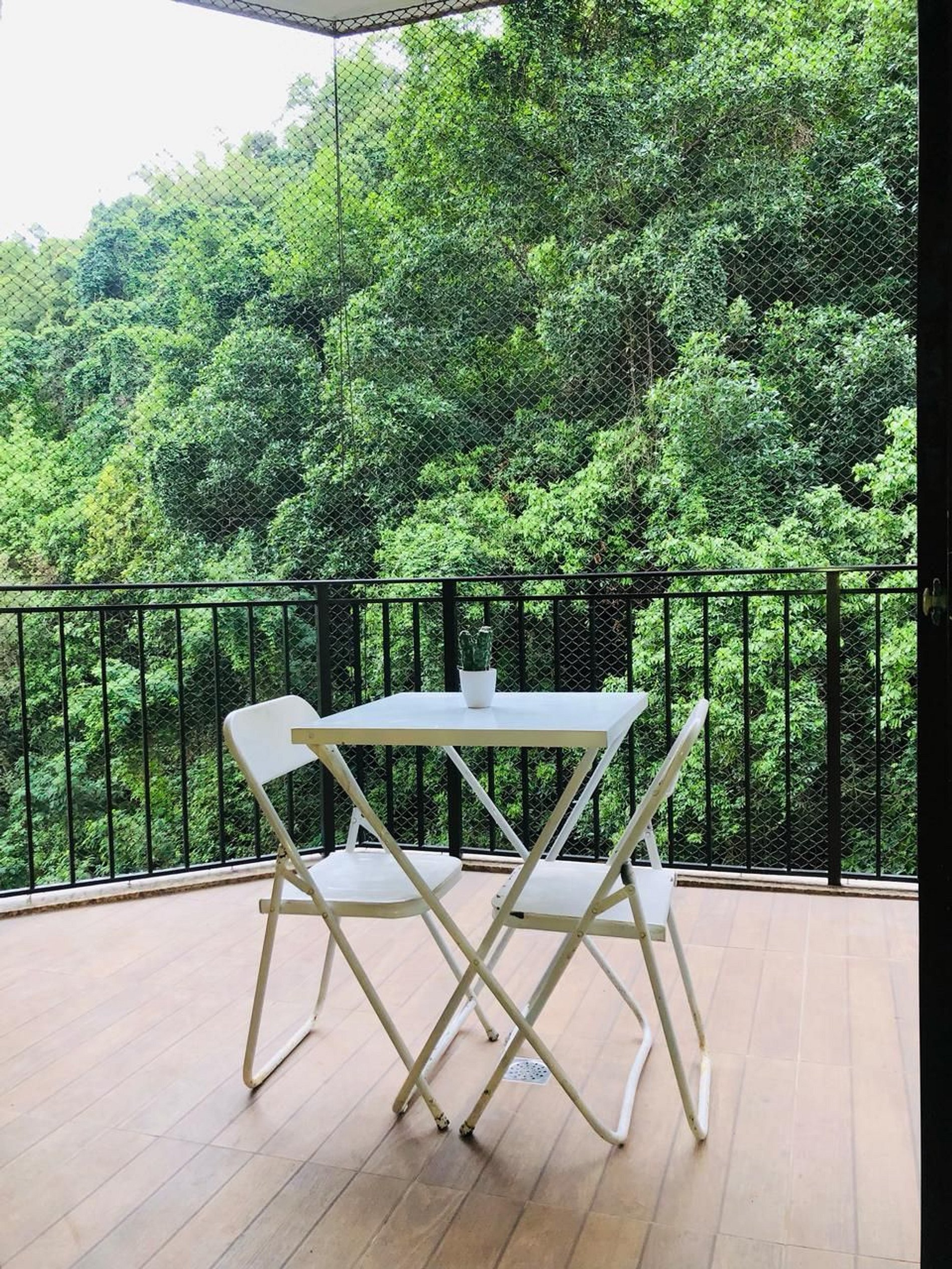 A varanda possui rede de proteção.
