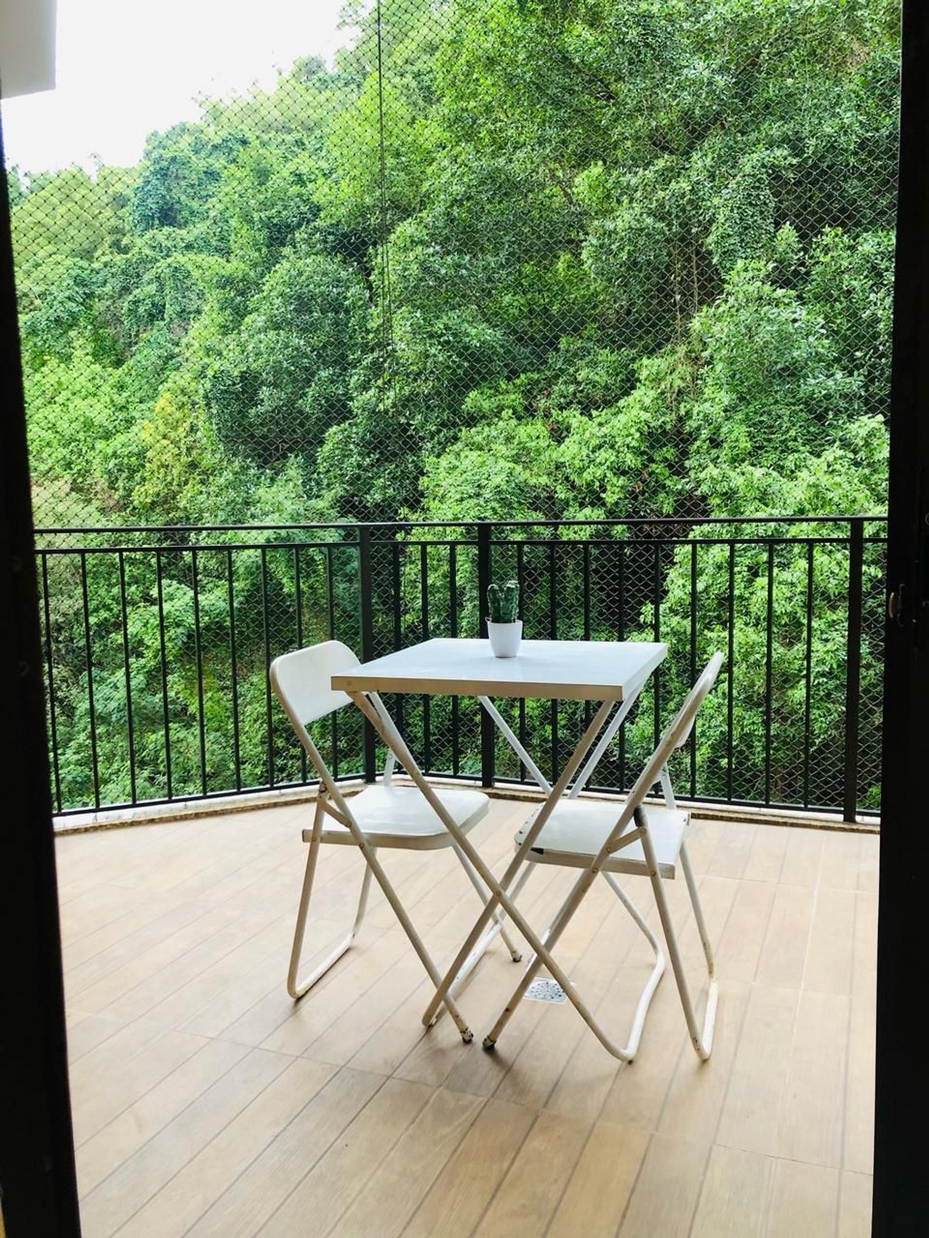 - Varanda com mesa e cadeiras, perfeita para um super café da manhã ou momento de relaxamento, com uma vista deslumbrante da montanha verde