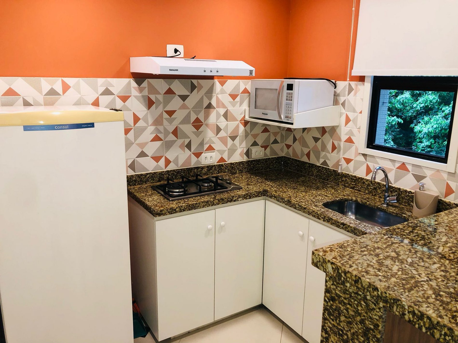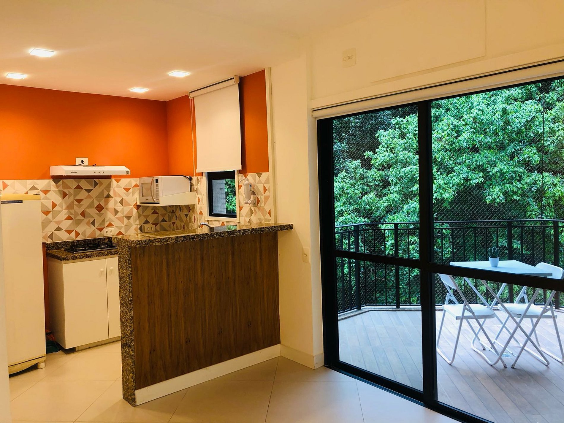 - Cozinha americana completa, com geladeira, coocktop, filtro de água, utensílios básicos, louça, panelas.