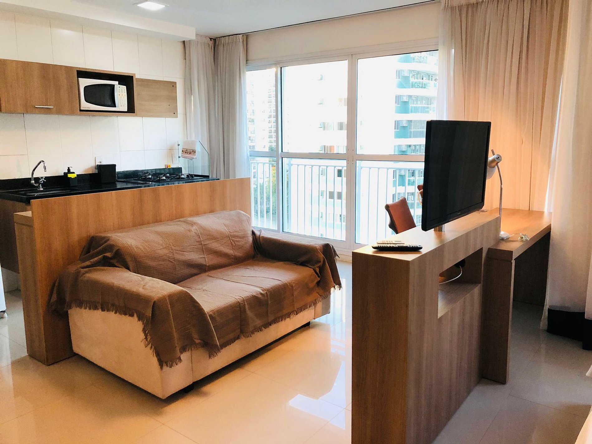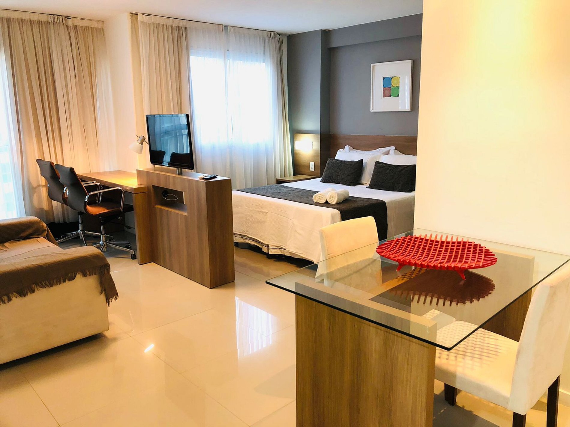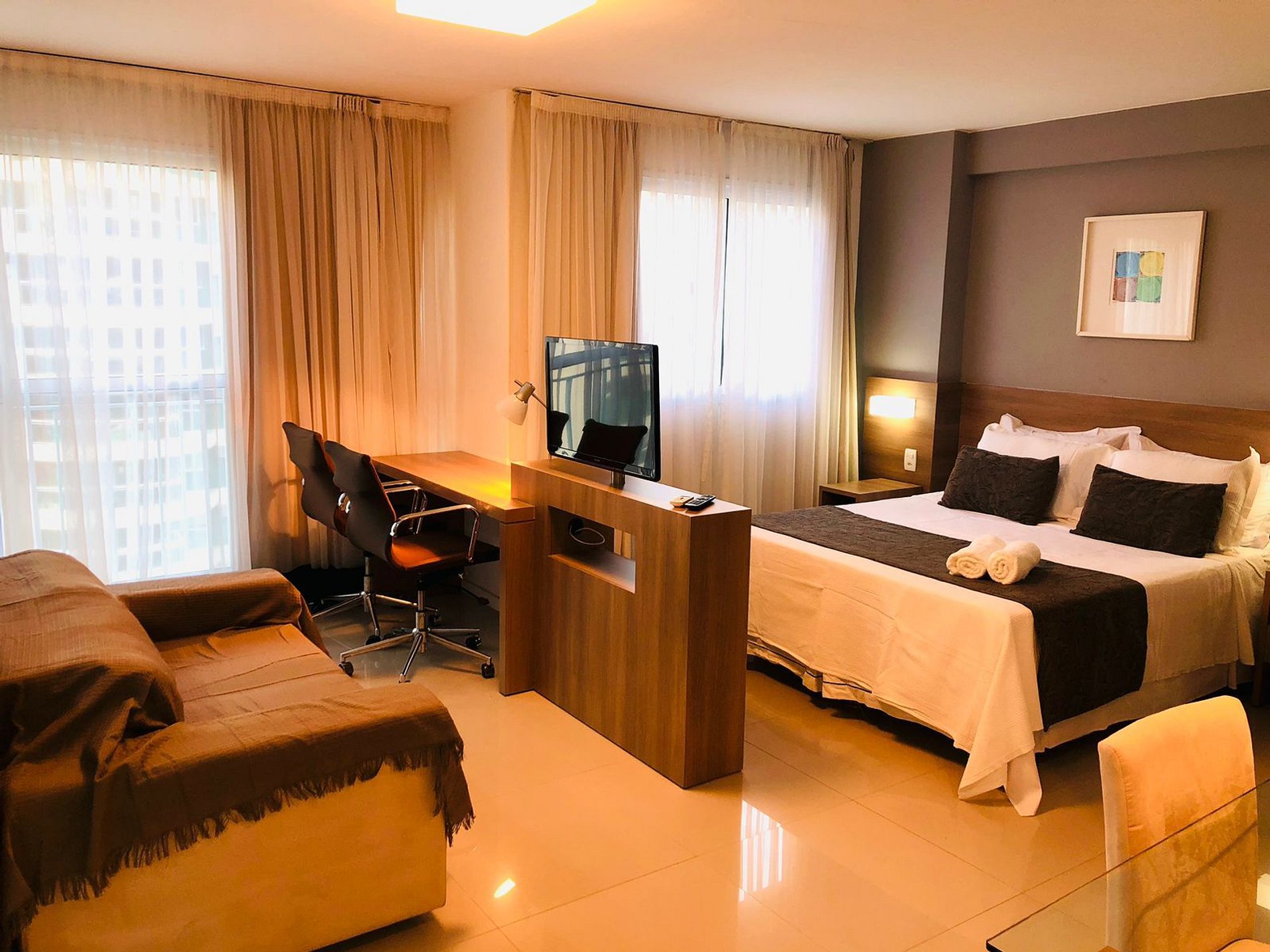 Flat moderno, funcional, equipado e bastante confortável. Excelente para trabalho e relaxar.