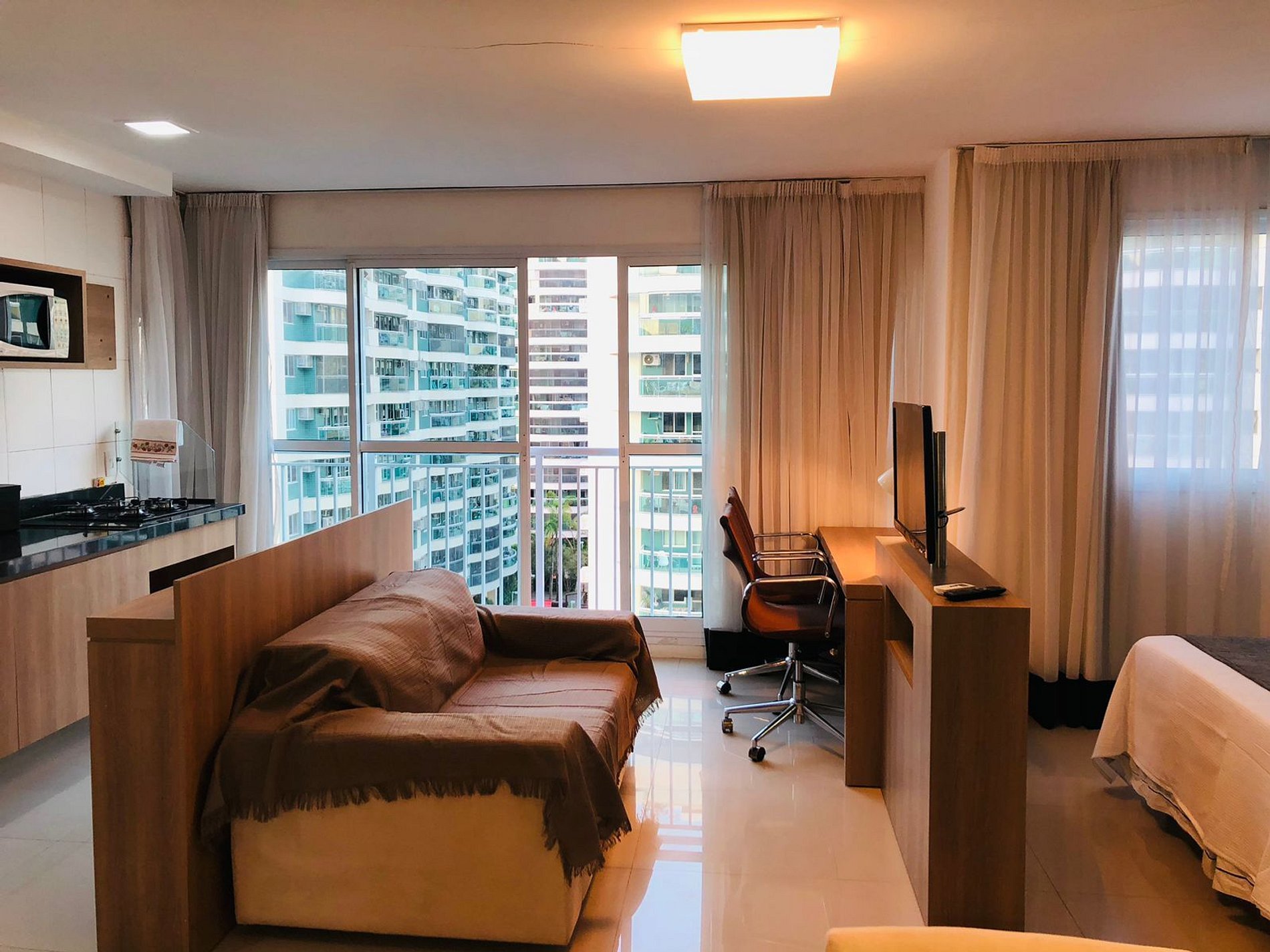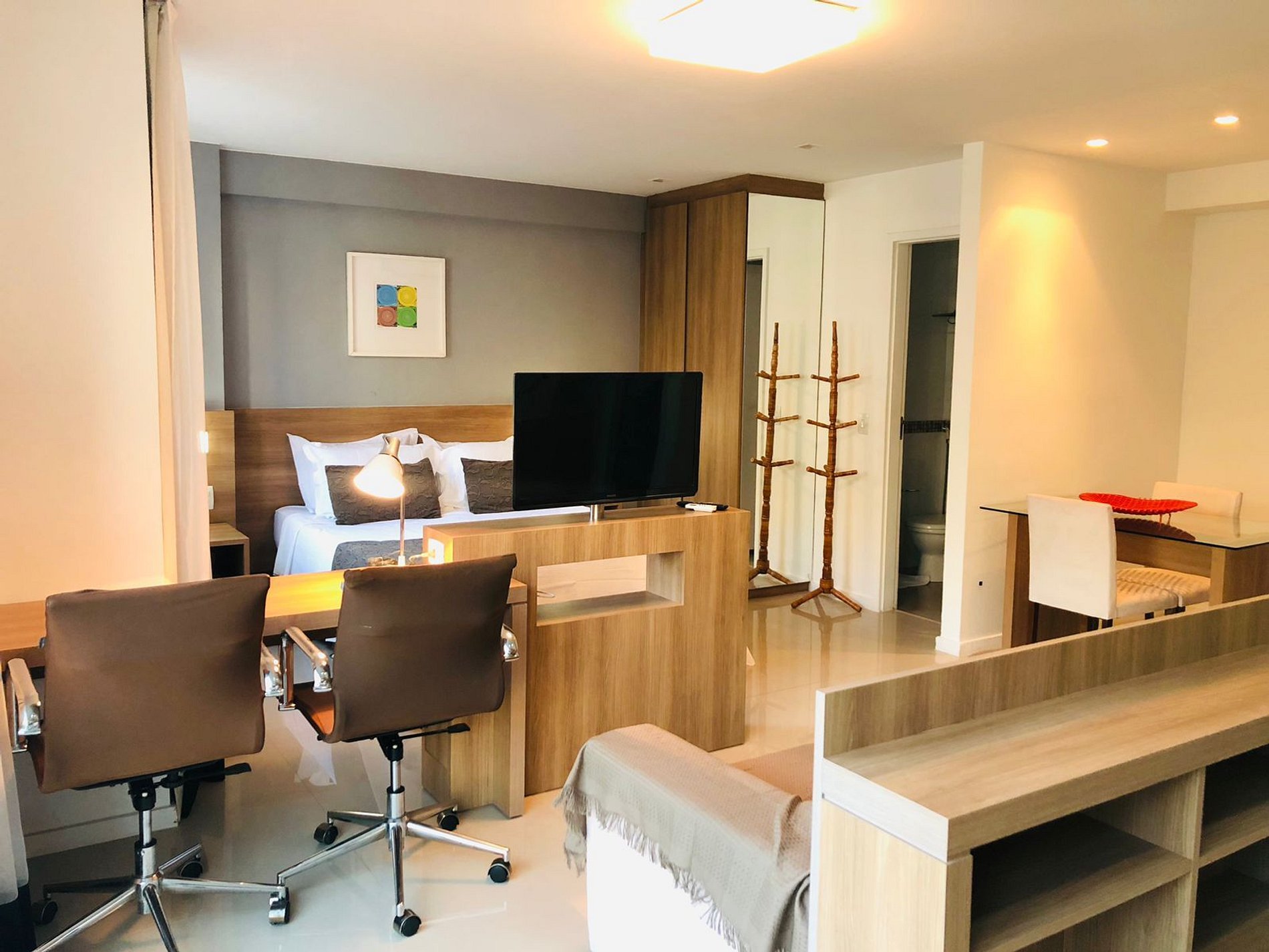 O apartamento é inteiro para os hóspedes. Quarto de casal integrado ao espaço de home office, a cozinha e ao espaço com mesa de jantar. A TV atende a todos esses ambientes.