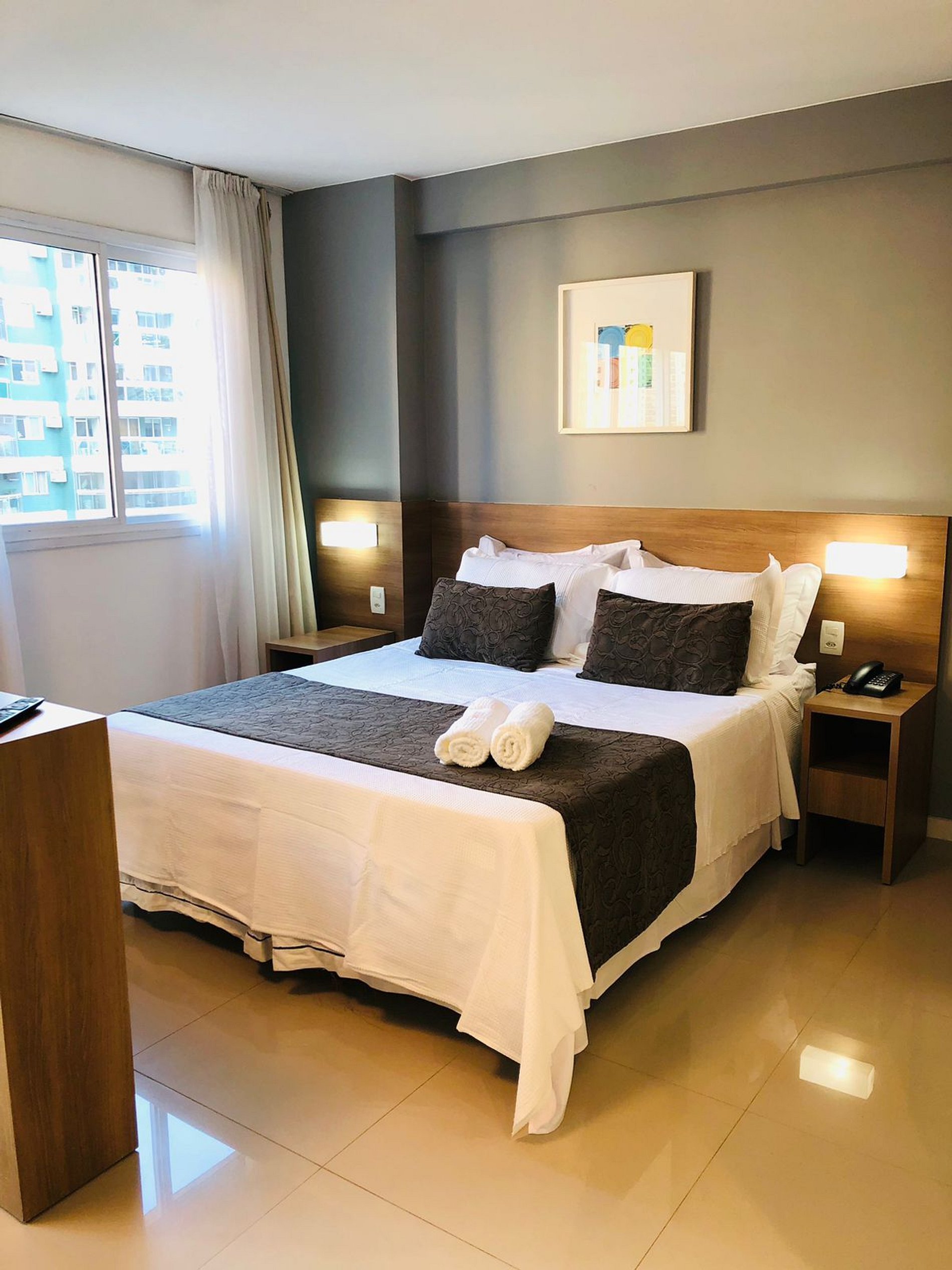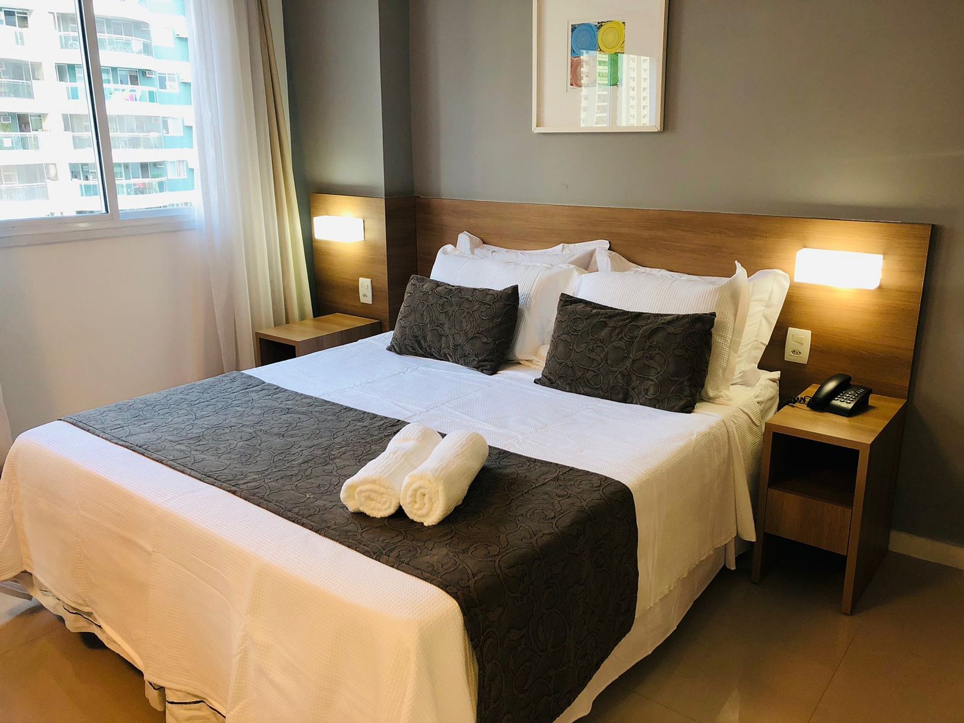 Cortinas com black out proporcionando uma noite tranquila.