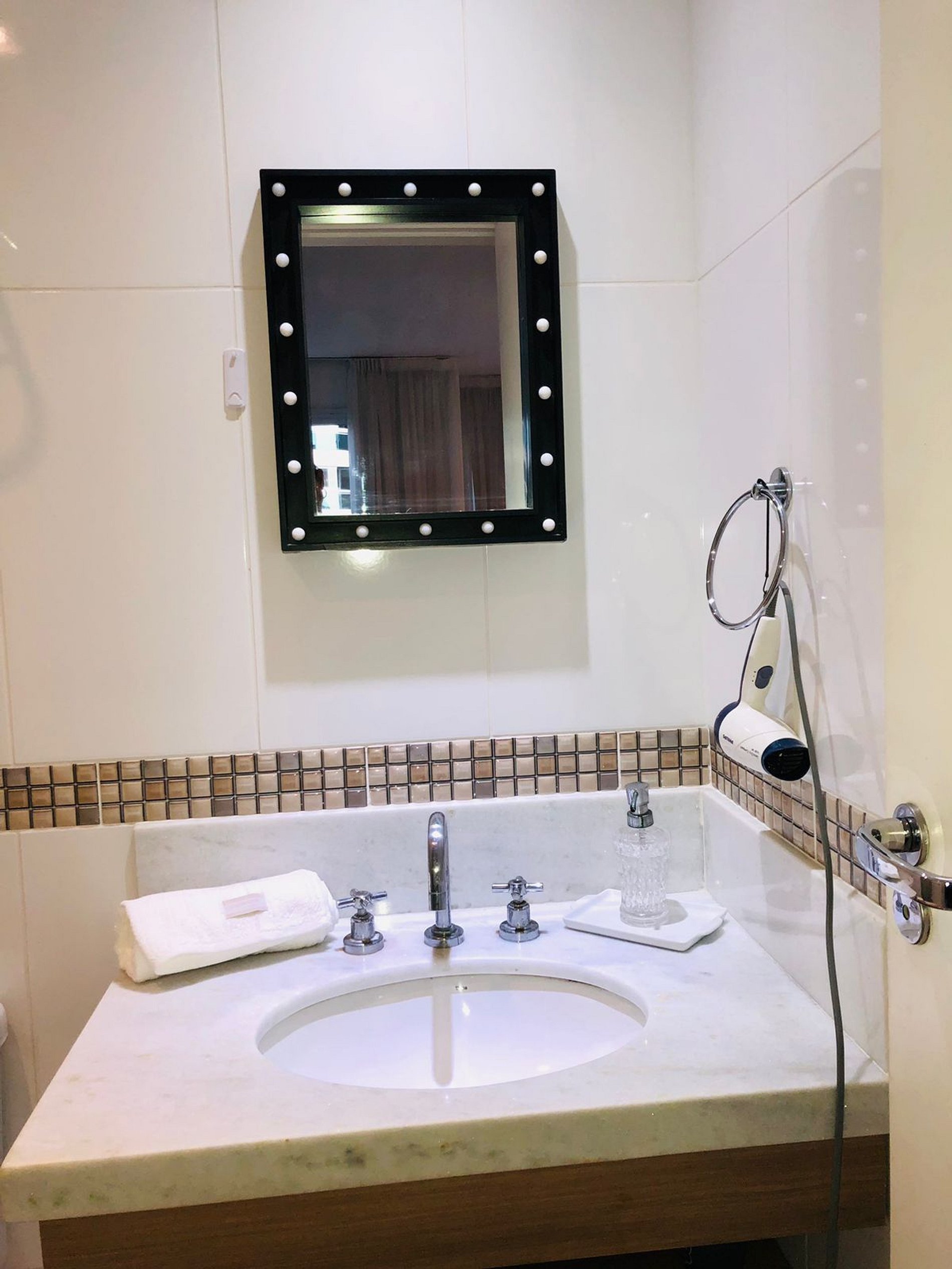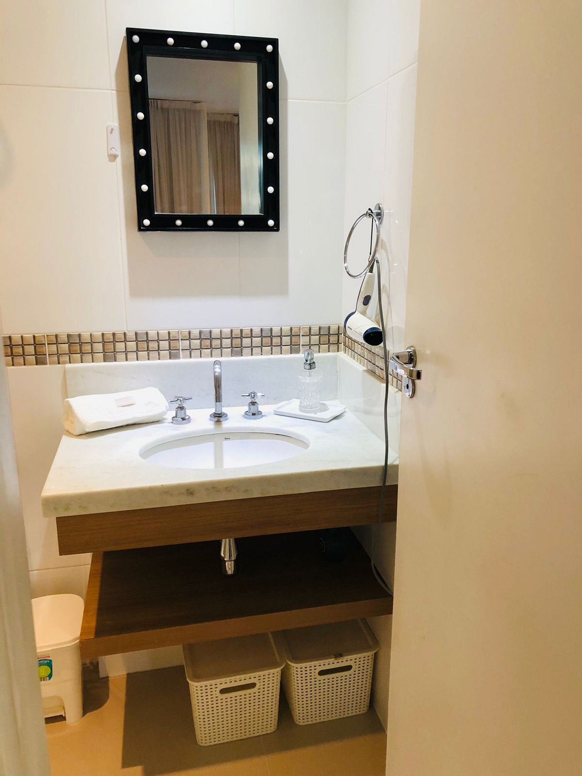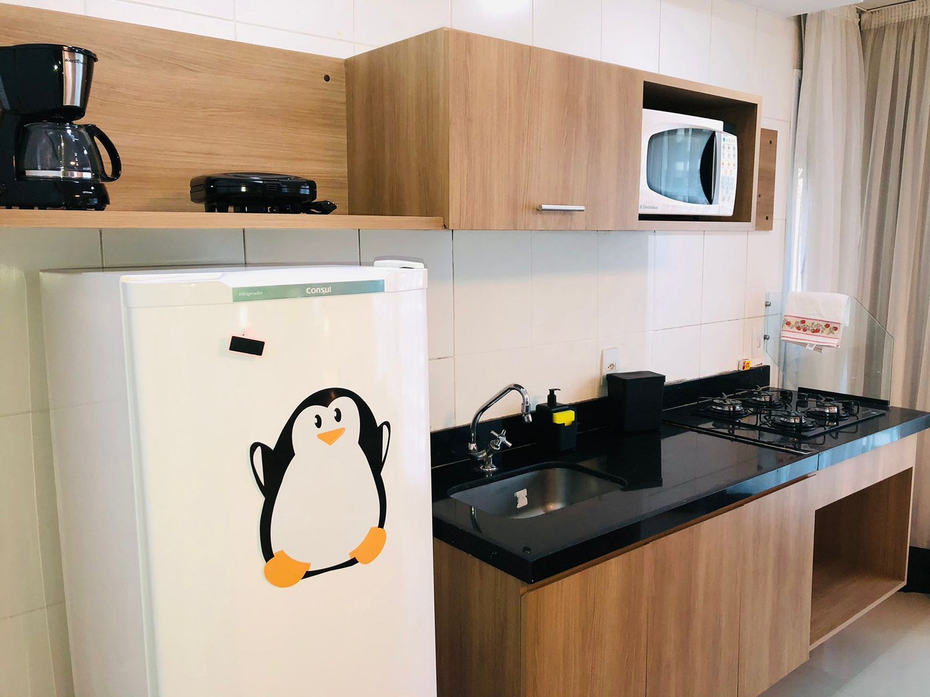 Ar split, TV LCD (não é smart), mas possui canais intermediários a cabo. Cozinha equipada com microondas, sanduicheira, cafeteira, cooktop, louças e talheres básicos. Banheiro com box blindex.