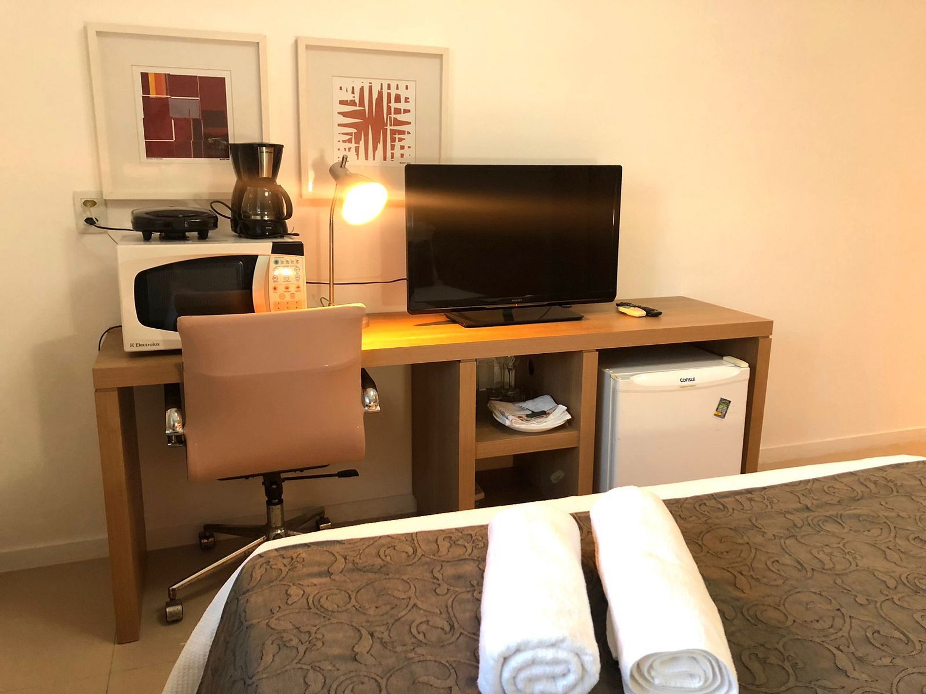O apartamento é inteiro para os hóspedes. Suíte de casal super confortável, com home office, TV com canais a cabo e internet própria de ótima qualidade e microondas.