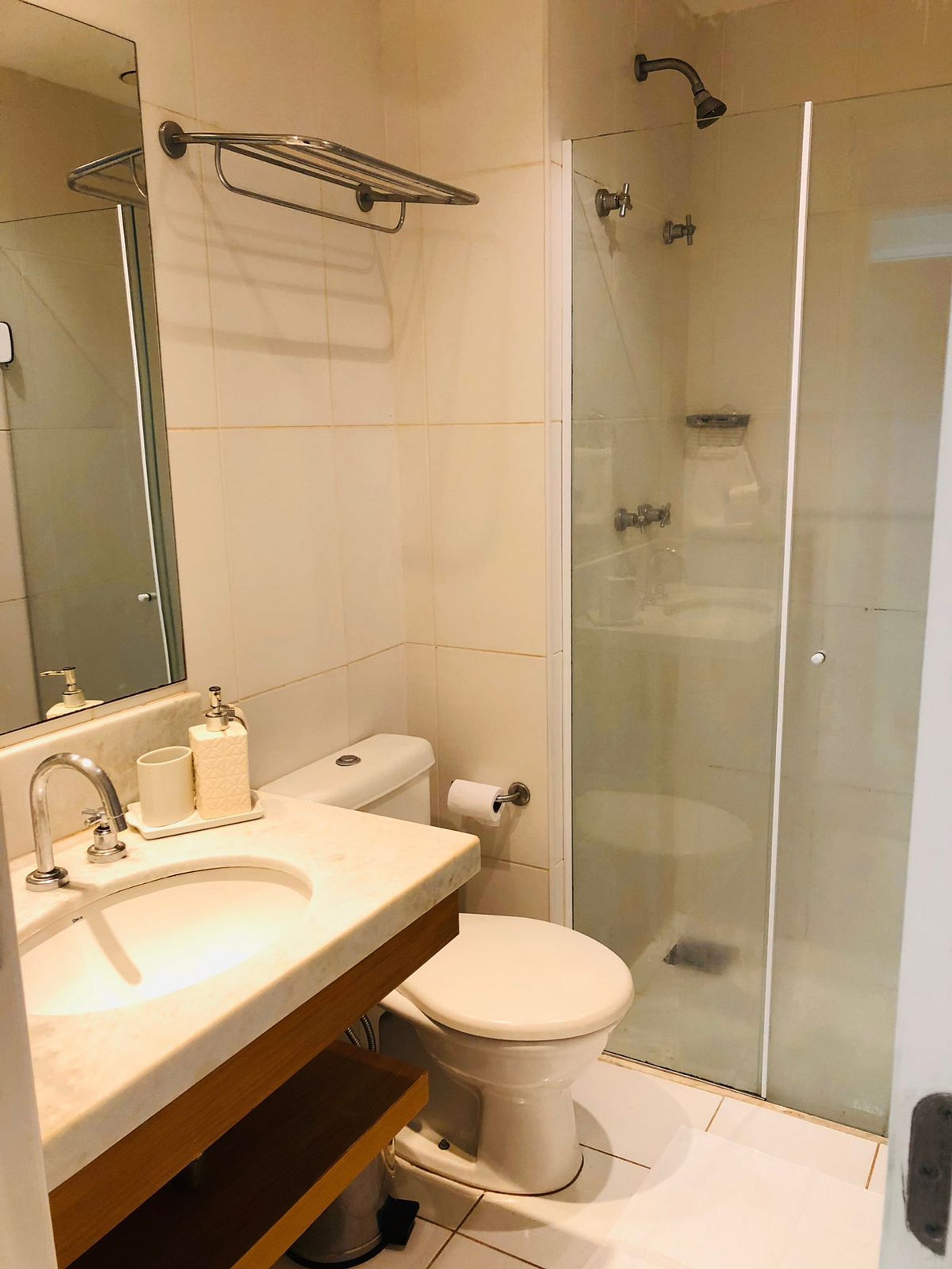 Ar split, TV LCD (não é smart), possui canais intermediários a cabo. Banheiro com box blindex.