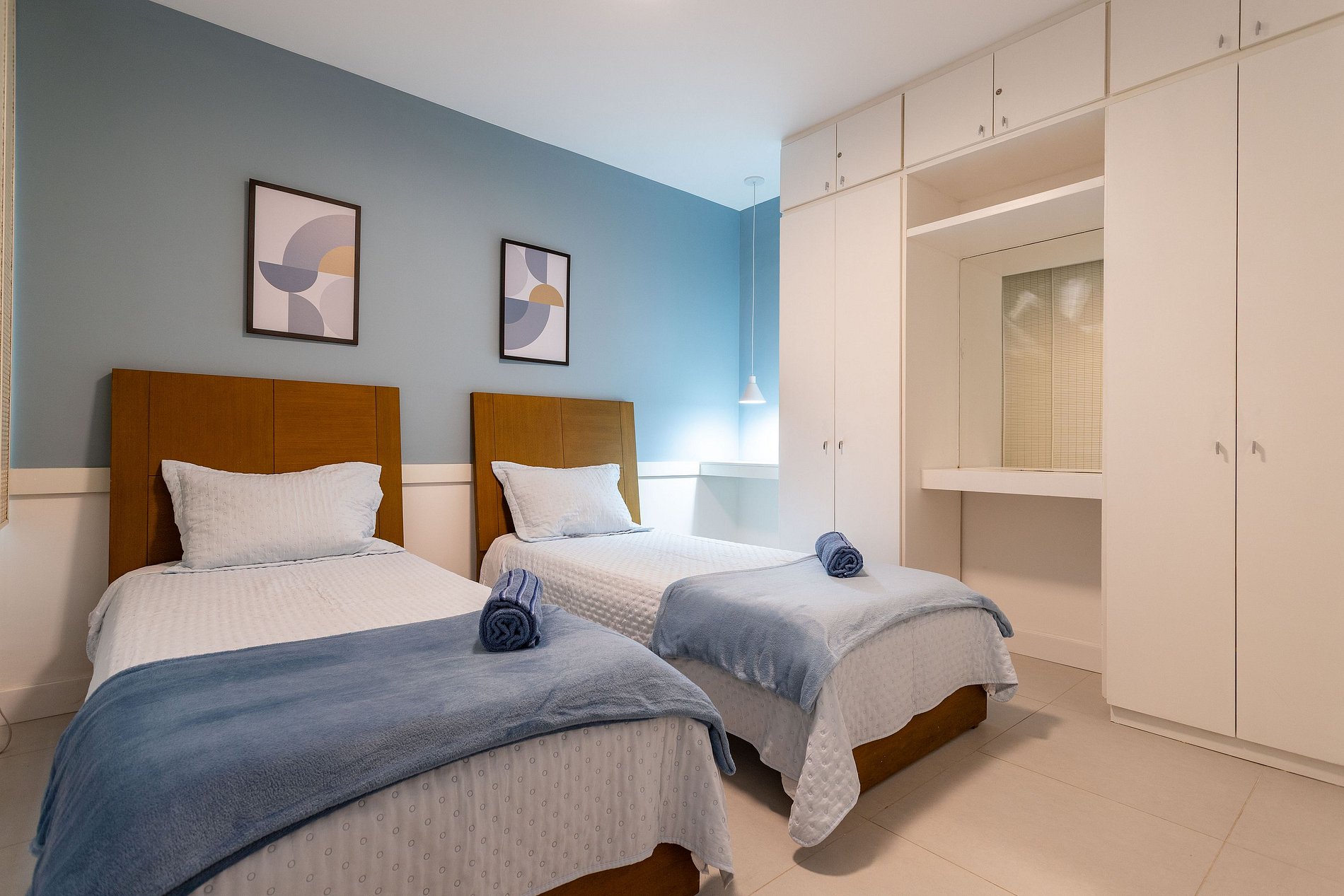3º Quarto com duas camas de solteiro, armário, ar condicionado, janelas com persianas black out.