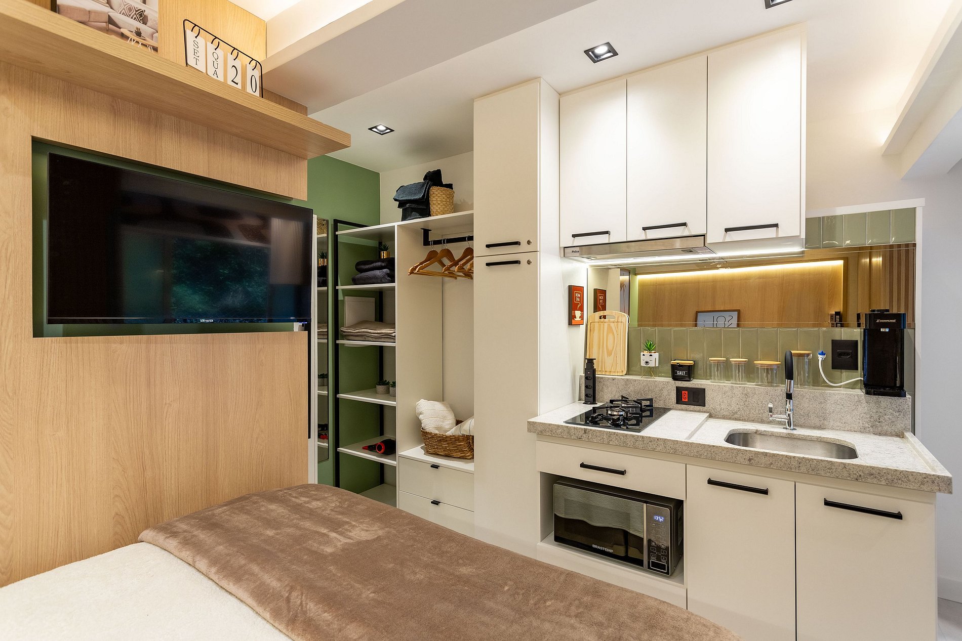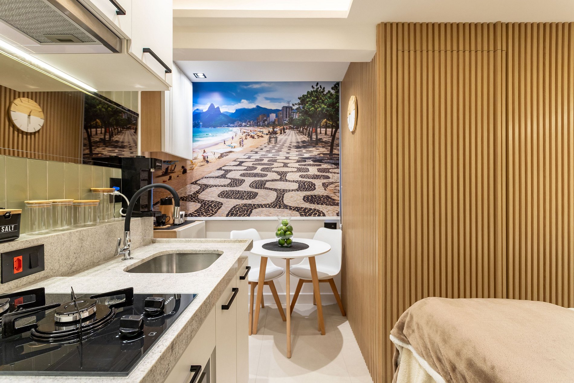 Todo o estúdio foi projetado com marcenaria de alta qualidade, cada canto foi pensado no bem estar e conforto do hóspede, que poderá desfrutar de uma experiência inesquecível em Ipanema .