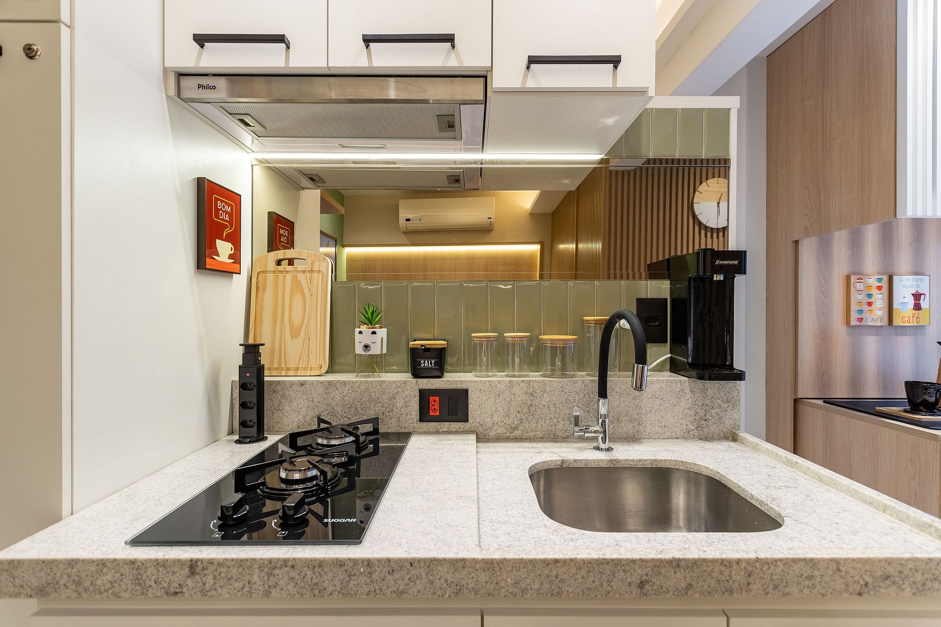 Mobiliado e Equipado: O estúdio está totalmente mobiliado e equipado com todas as comodidades necessárias para a sua estadia, incluindo uma cozinha compacta, , bem completa, banheiro moderno e requintado, cama confortável, ar split, arara de roupas, projeto de iluminação e Wi-Fi de alta velocidade.