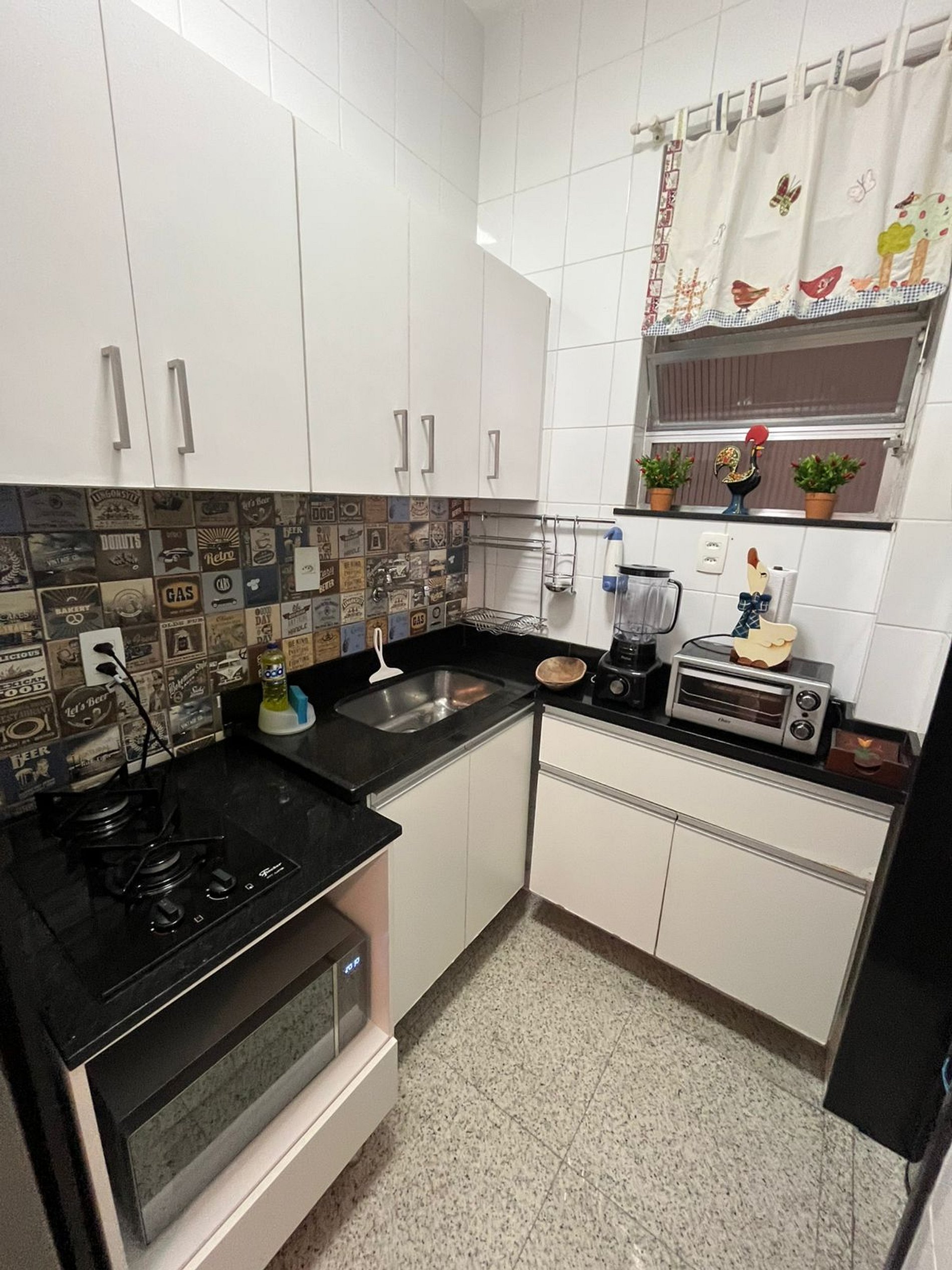 Cozinha equipada com utensílios, geladeira, microondas e fogão