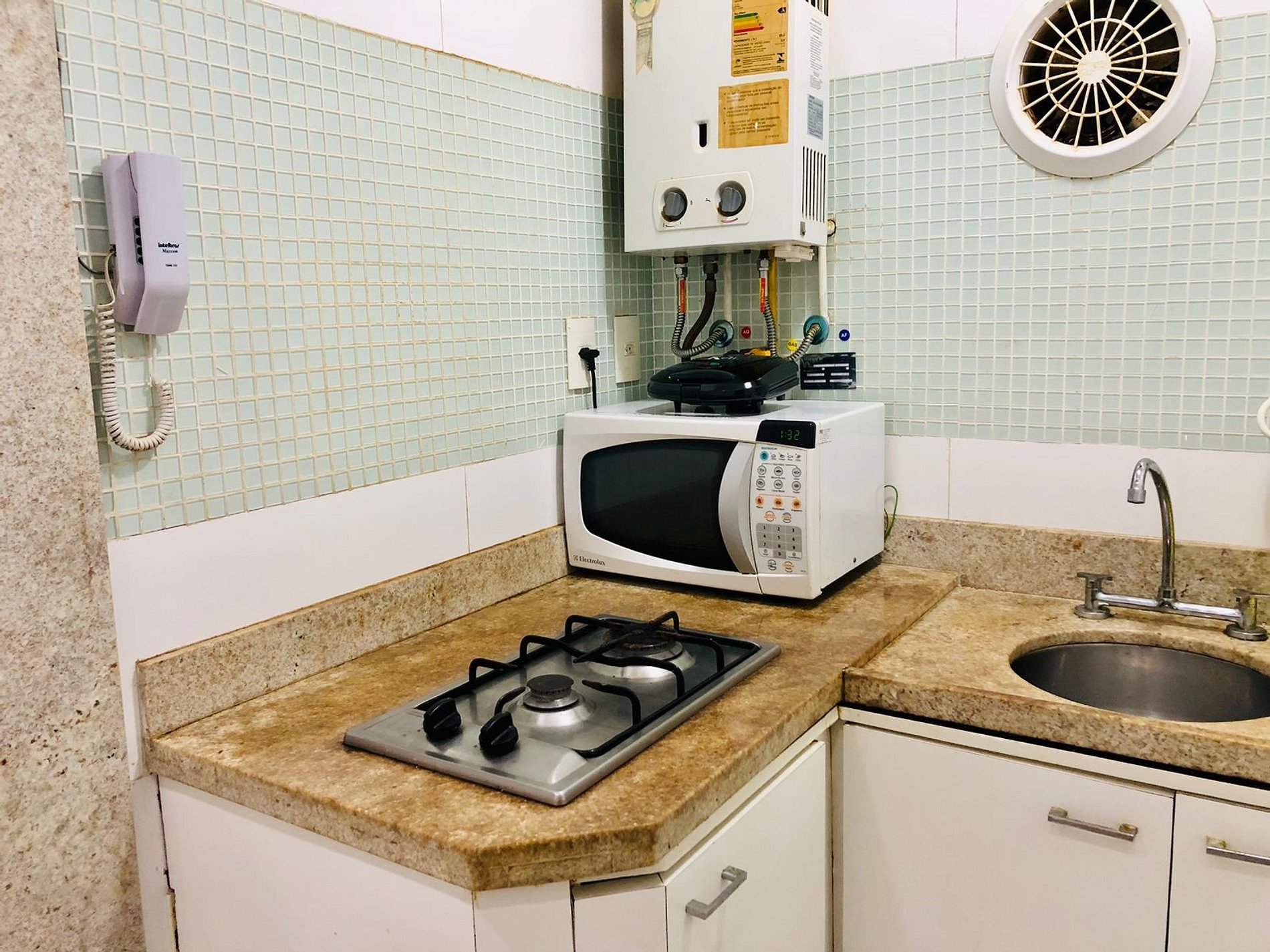 Cozinha equipada com cafeteira, sanduicheira, liquidificador, eletrodomésticos, microondas e utensílios básicos de cozinha.